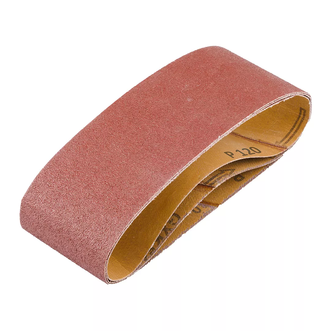 Pasy bezkońcowe, ścierne, P120, 3 sztuki, długość 457 mm, szerokość 75 mm, elektrokorund, baza z płótna typu X, nasyp półotwarty, zastosowanie: metal, drewno, tworzywo sztuczne