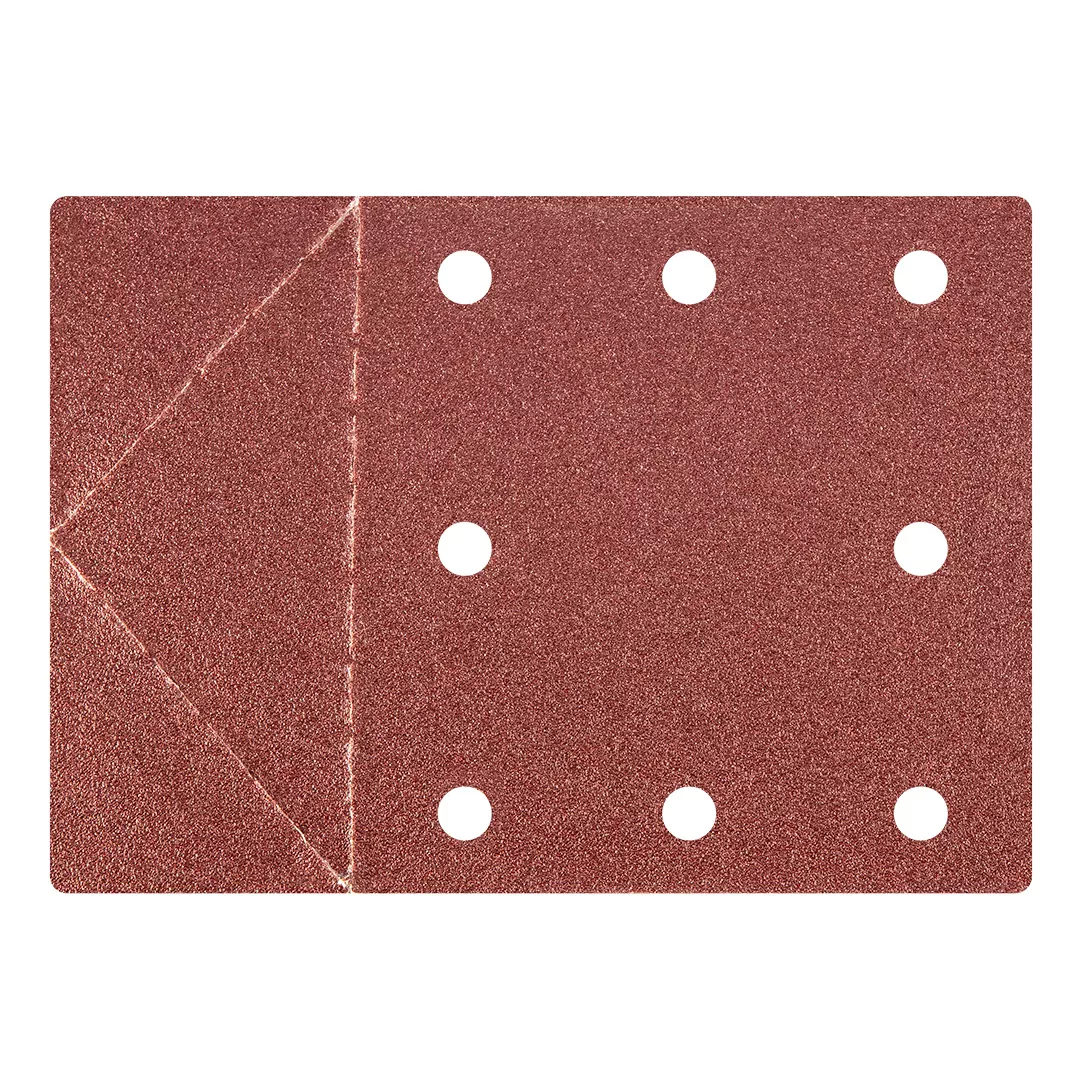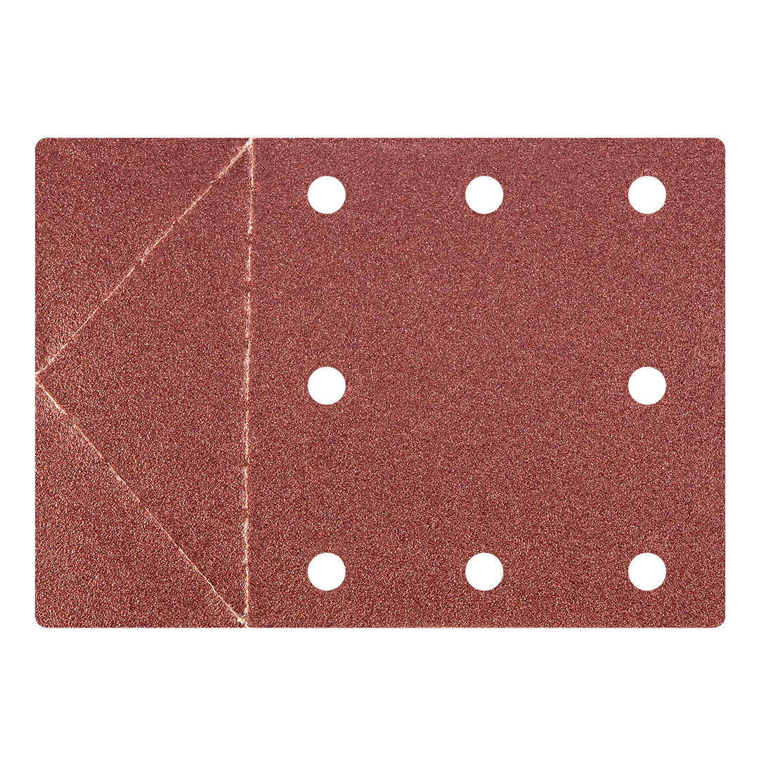 Papier ścierny na rzep, P100, 8 otworów, 3 sztuki, długość 160 mm, szerokość 115 mm, średnica otworów 8 mm, perforacja do odrywania, zastosowanie: do metalu, drewna, materiałów sztucznych