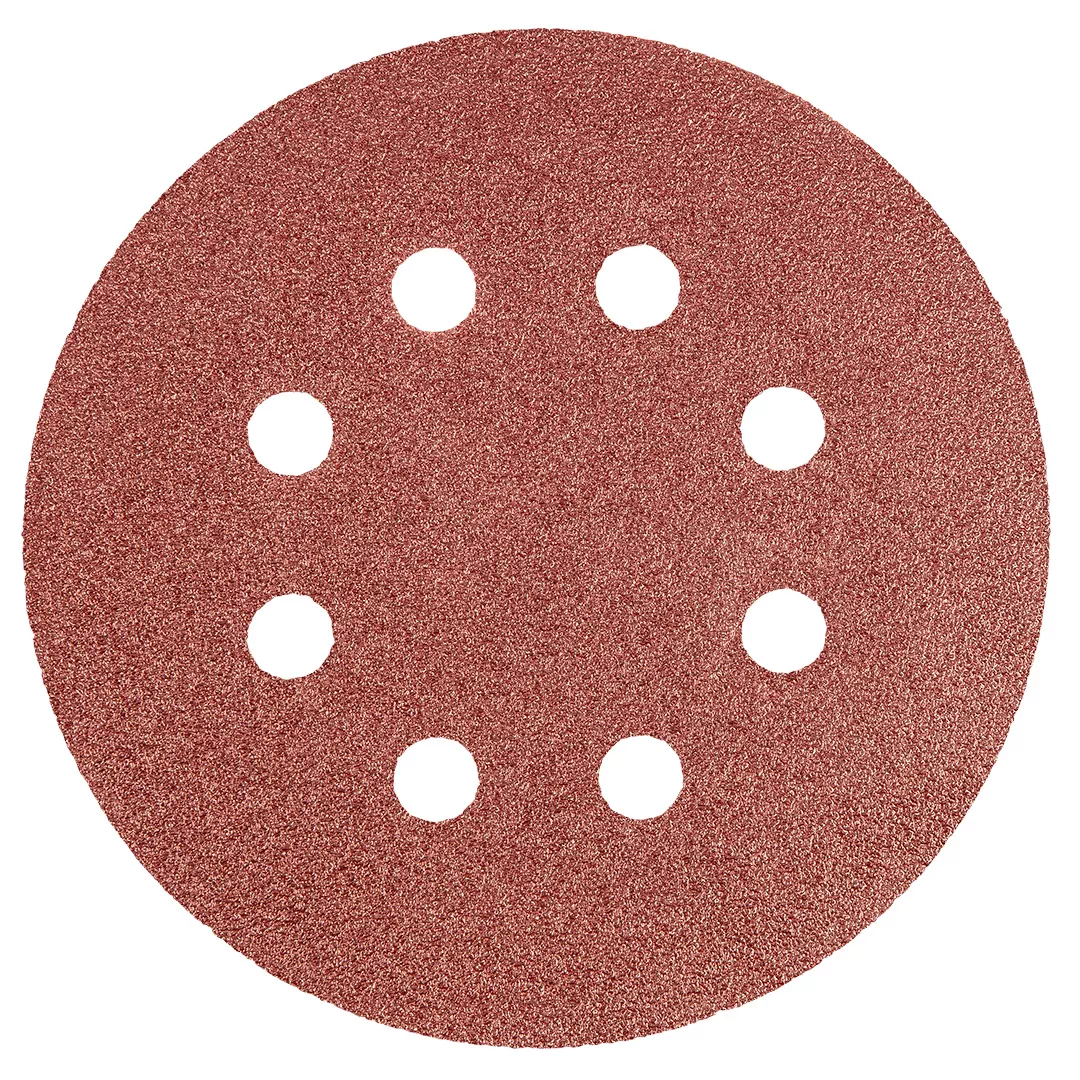 Krążki ścierne na rzep, średnica 125 mm, średnica między środkami otworów 65 mm, średnica otworów 10 mm, 5 sztuk, z 8 otworami, P80, elektrokorund, nasyp półotwarty, baza z papieru typu E, zastosowanie: metal, tworzywo sztuczne, drewno