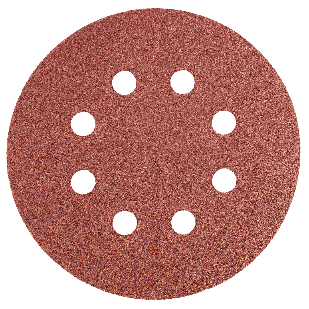 Krążki ścierne na rzep, średnica 125 mm, średnica między środkami otworów 65 mm, średnica otworów 10 mm, 5 sztuk, z 8 otworami, P120, elektrokorund, nasyp półotwarty, baza z papieru typu E, zastosowanie: metal, tworzywo sztuczne, drewno