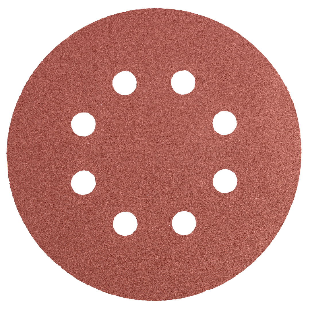 Krążki ścierne na rzep, średnica 125 mm, średnica między środkami otworów 65 mm, średnica otworów 10 mm, 5 sztuk, z 8 otworami, P240, elektrokorund, nasyp półotwarty, baza z papieru typu E, zastosowanie: metal, tworzywo sztuczne, drewno