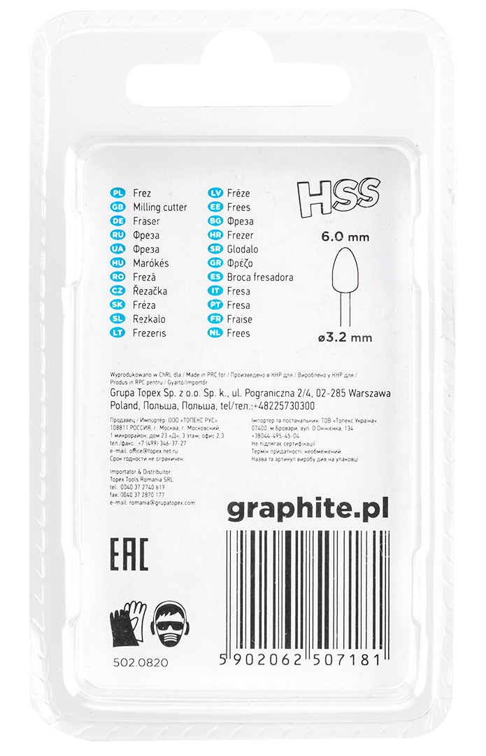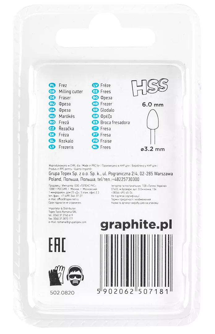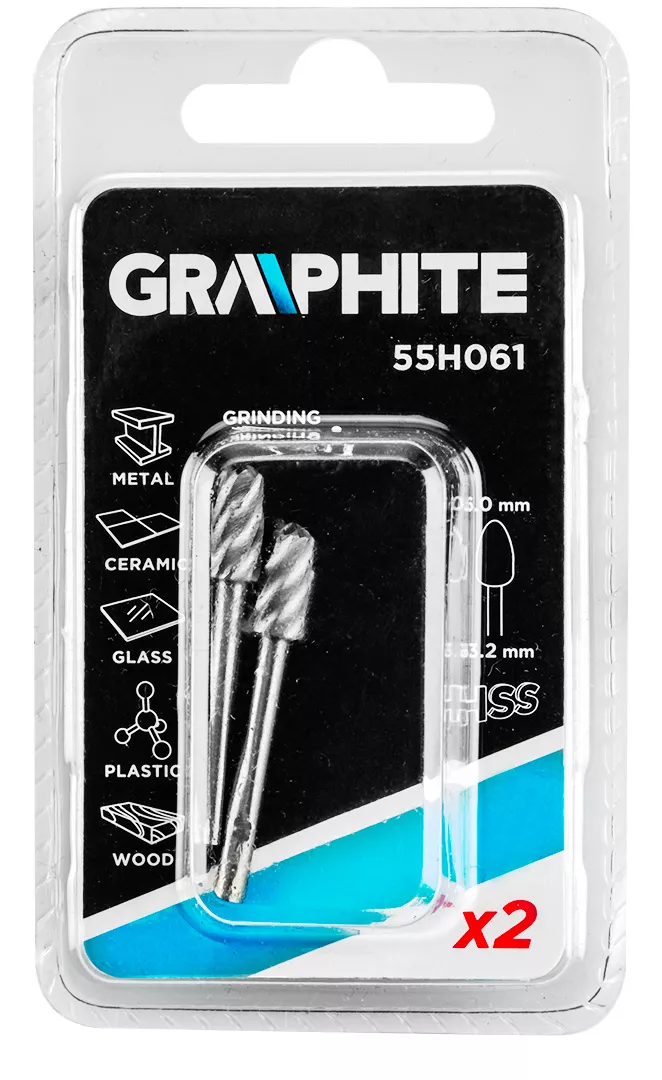 Frez HSS GRAPHITE (nr ref. 55H061) w kształcie pocisku o średnicy 6.0 mm. Zestaw zawiera 2 sztuki. Przeznaczone są do stosowania z miniszlifierką. Nadaje się do kształtowania, drążenia, wykonywania żłobień, dłutowania, wykonywania gwintowanych otworów w różnych materiałach. Można stosować je do metali, tworzyw sztucznych, włókna szklanego oraz drewna.