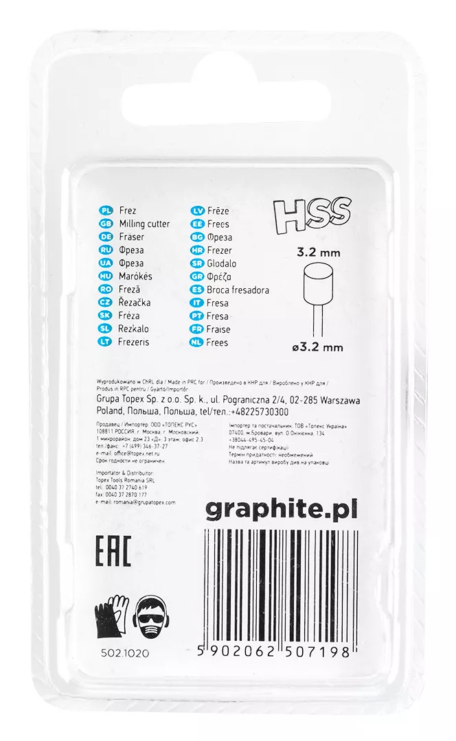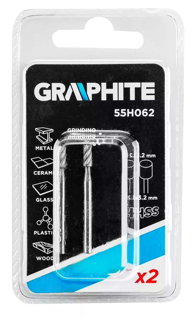 Frez HSS GRAPHITE (nr ref. 55H062) w kształcie walca o średnicy 3.2 mm. Zestaw zawiera 2 sztuki. Przeznaczone są do stosowania z miniszlifierką. Nadaje się do kształtowania, drążenia, wykonywania żłobień, dłutowania, wykonywania gwintowanych otworów w różnych materiałach. Można stosować je do metali, tworzyw sztucznych, włókna szklanego oraz drewna.