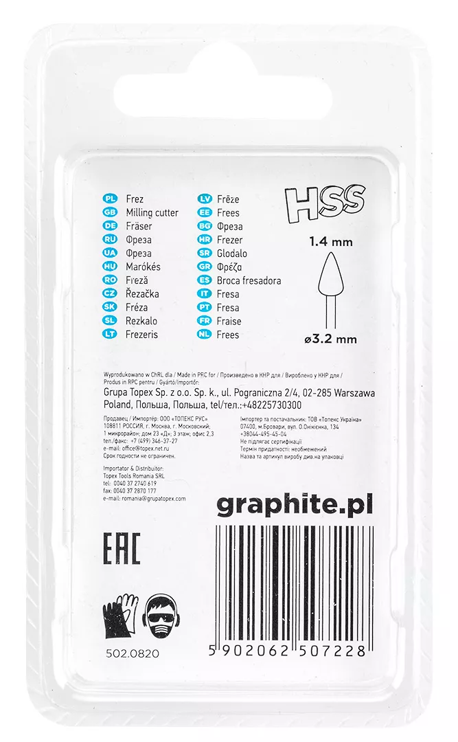 Frez HSS GRAPHITE (nr ref. 55H065) w kształcie stożka o średnicy 1.4 mm. Zestaw zawiera 2 sztuki. Przeznaczone są do stosowania z miniszlifierką. Nadaje się do kształtowania, drążenia, wykonywania żłobień, dłutowania, wykonywania gwintowanych otworów w różnych materiałach. Można stosować je do metali, tworzyw sztucznych, włókna szklanego oraz drewna.