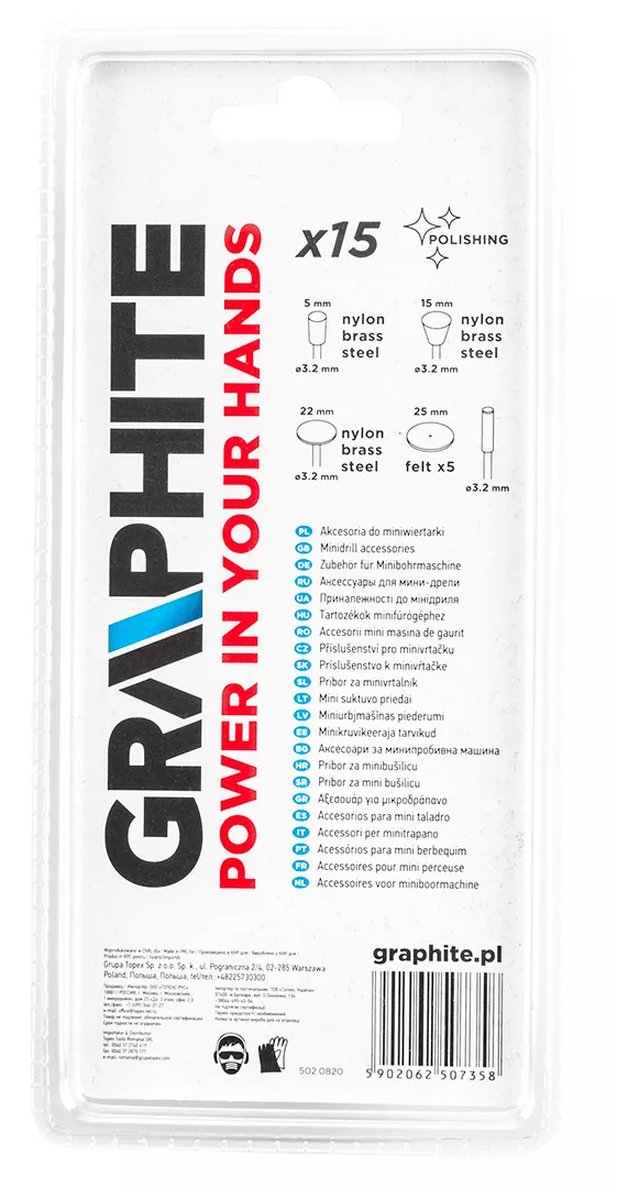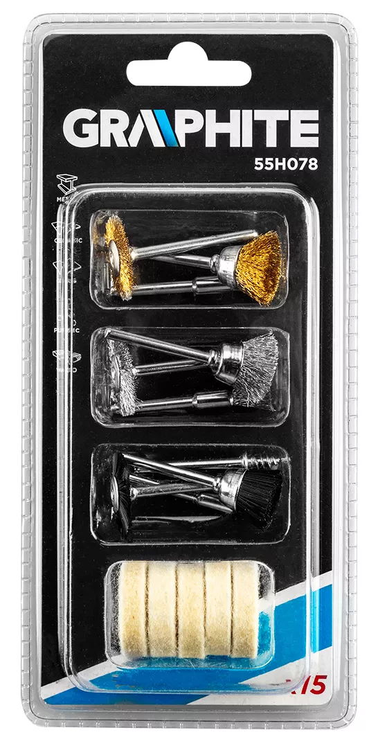 Akcesoria do miniszlifierki GRAPHITE (nr ref. 55H078), zestaw zawiera 15 szt. narzędzi polerskich. Przeznaczone są do stosowania z miniszlifierką. Nadaje się do polerowania, wygładzania i szlifowania większości materiałów. Można stosować je do obróbki: metali, odlewów, spoin spawanych, nitów, usuwania rdzy, ceramiki, szkła, drewna, plastiku.