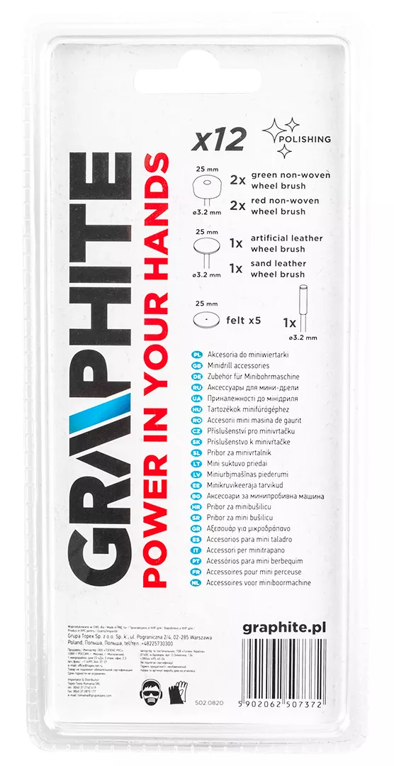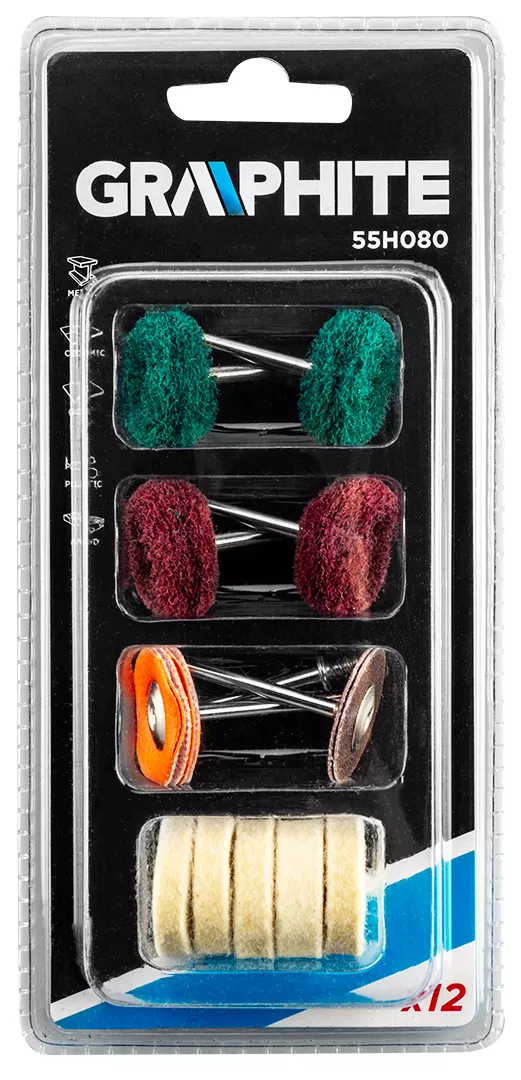 Akcesoria do miniszlifierki GRAPHITE (nr ref. 55H080), zestaw zawiera 12 szt. narzędzi polerskich. Przeznaczone są do stosowania z miniszlifierką. Nadaje się do polerowania, wygładzania i szlifowania większości materiałów. Można stosować je do obróbki: metali, odlewów, spoin spawanych, nitów, usuwania rdzy, ceramiki, szkła, drewna, plastiku.