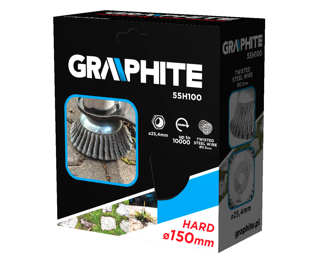 Szczotka druciana do kosy spalinowej 150 x 25,4 mm, twarda, druty splątane 55H100 marki GRAPHITE to tarcza szczotkowa do kos spalinowych. Posiada wymiary 150 x 25,5 mm średnicy zewnętrznej oraz wewnętrznej otworu. Umożliwia czyszczenie kostek brukowych oraz metalowych powierzchni. Wykonana została z trwałego splotu drucianego. Marka GRAPHITE jest gwarancją trwałości na lata.