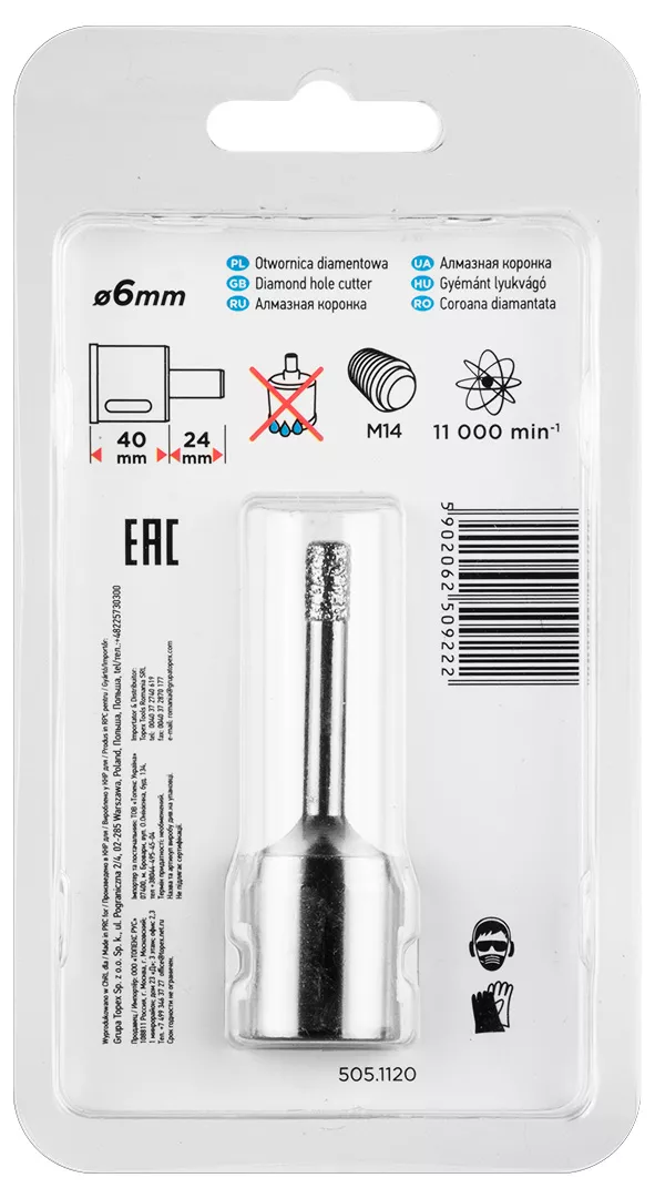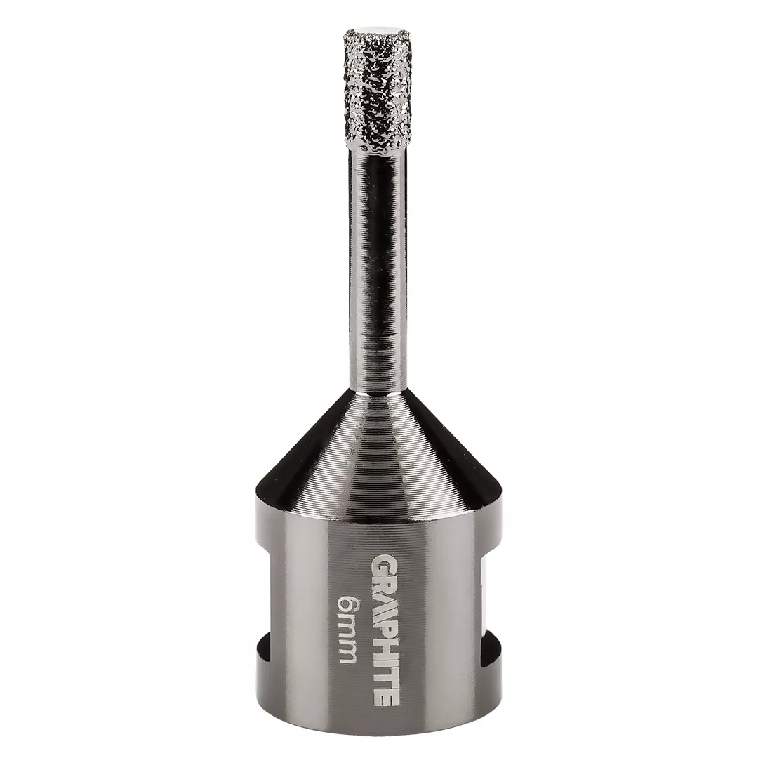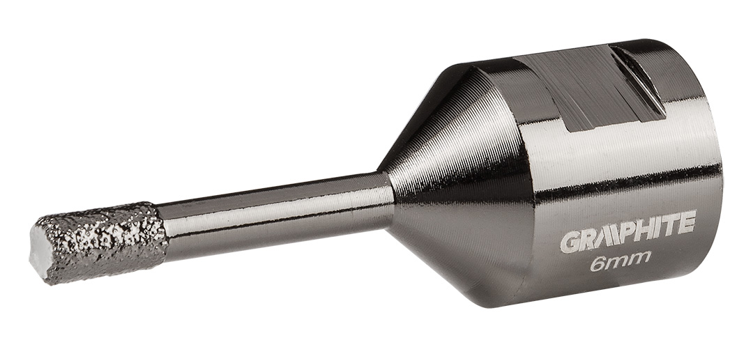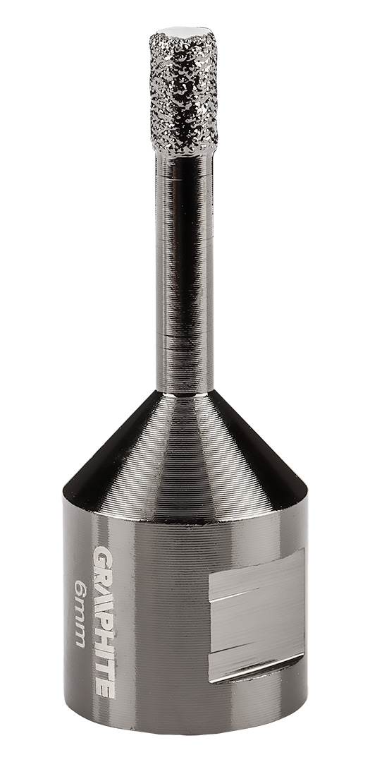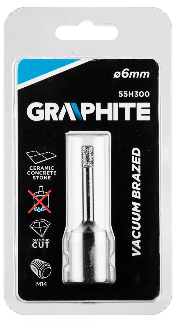 Otwornica diamentowa GRAPHITE (nr ref. 55H300) o średnicy 6 mm z gwintem M14 przeznaczona jest do precyzyjnego cięcia kamienia, gresu, płytek, szkła, asfaltu, cegły, betonu. Dzięki wykorzystaniu diamentu moc tnąca skupiona jest na niewielkim obszarze, co likwiduje ryzyko popękania lub uszkodzenia powierzchni. Nadaje się do pracy na sucho. Otwornica została zlutowana próżniowo, co zwiększą jej odporność.
