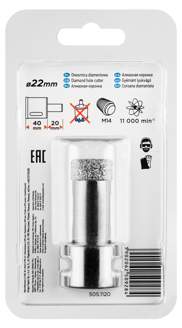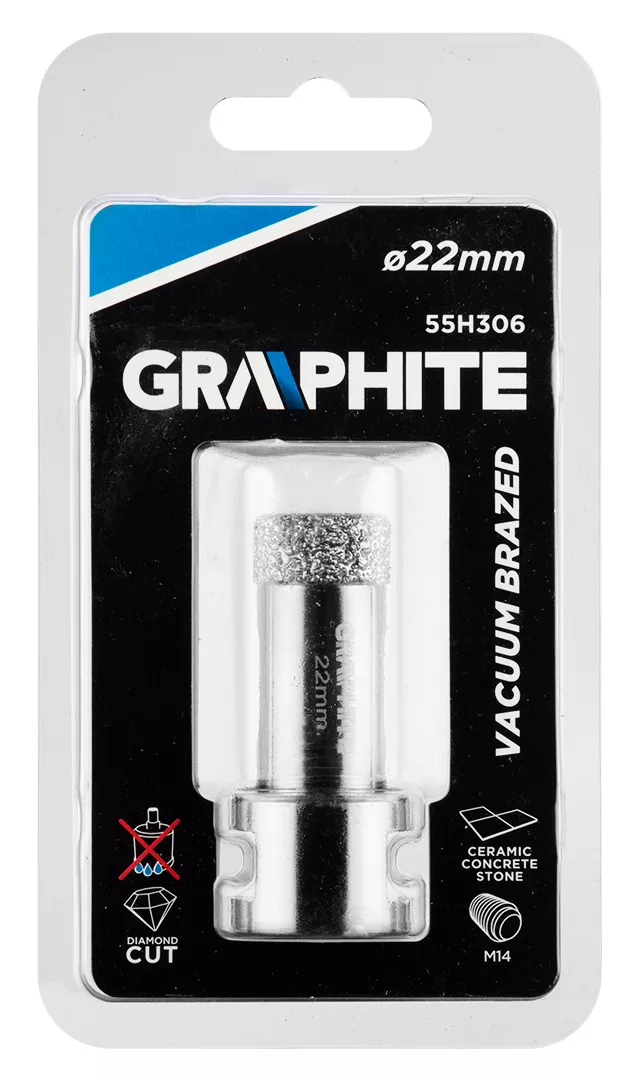 Otwornica diamentowa GRAPHITE (nr ref. 55H306) o średnicy 22 mm z gwintem M14 przeznaczona jest do precyzyjnego cięcia kamienia, gresu, płytek, szkła, asfaltu, cegły, betonu. Dzięki wykorzystaniu diamentu moc tnąca skupiona jest na niewielkim obszarze, co likwiduje ryzyko popękania lub uszkodzenia powierzchni. Nadaje się do pracy na sucho. Otwornica została zlutowana próżniowo, co zwiększą jej odporność.
