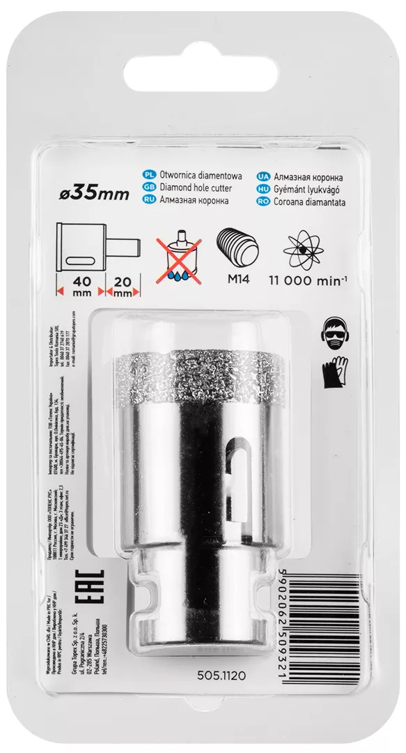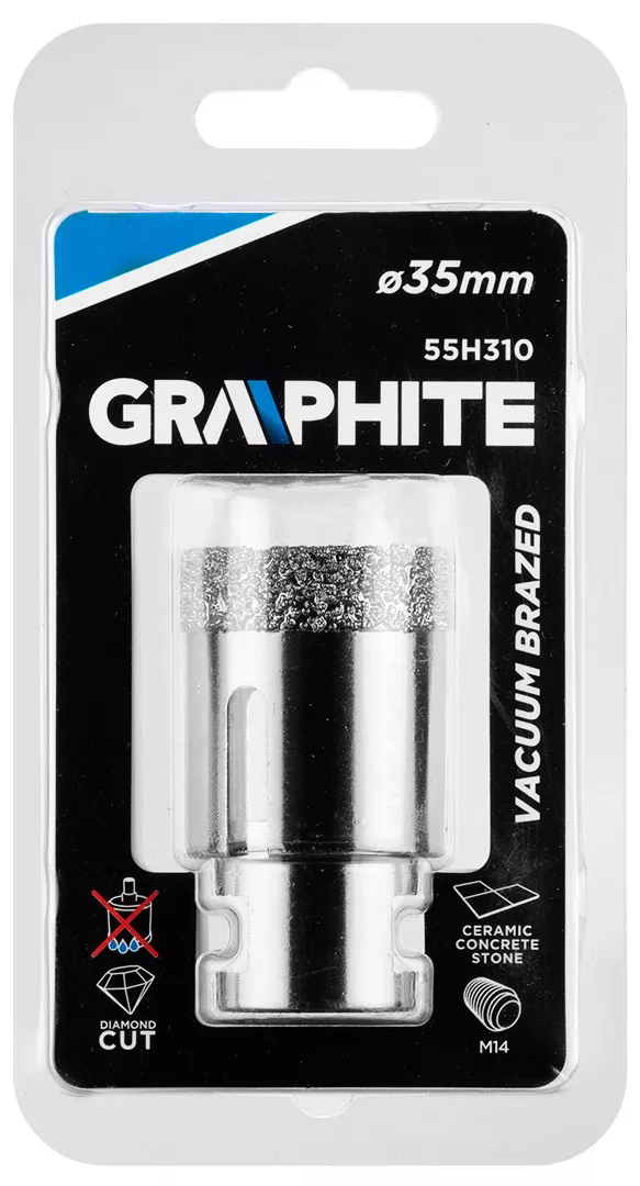Otwornica diamentowa GRAPHITE (nr ref. 55H310) o średnicy 35 mm z gwintem M14 przeznaczona jest do precyzyjnego cięcia kamienia, gresu, płytek, szkła, asfaltu, cegły, betonu. Dzięki wykorzystaniu diamentu moc tnąca skupiona jest na niewielkim obszarze, co likwiduje ryzyko popękania lub uszkodzenia powierzchni. Nadaje się do pracy na sucho. Otwornica została zlutowana próżniowo, co zwiększą jej odporność.