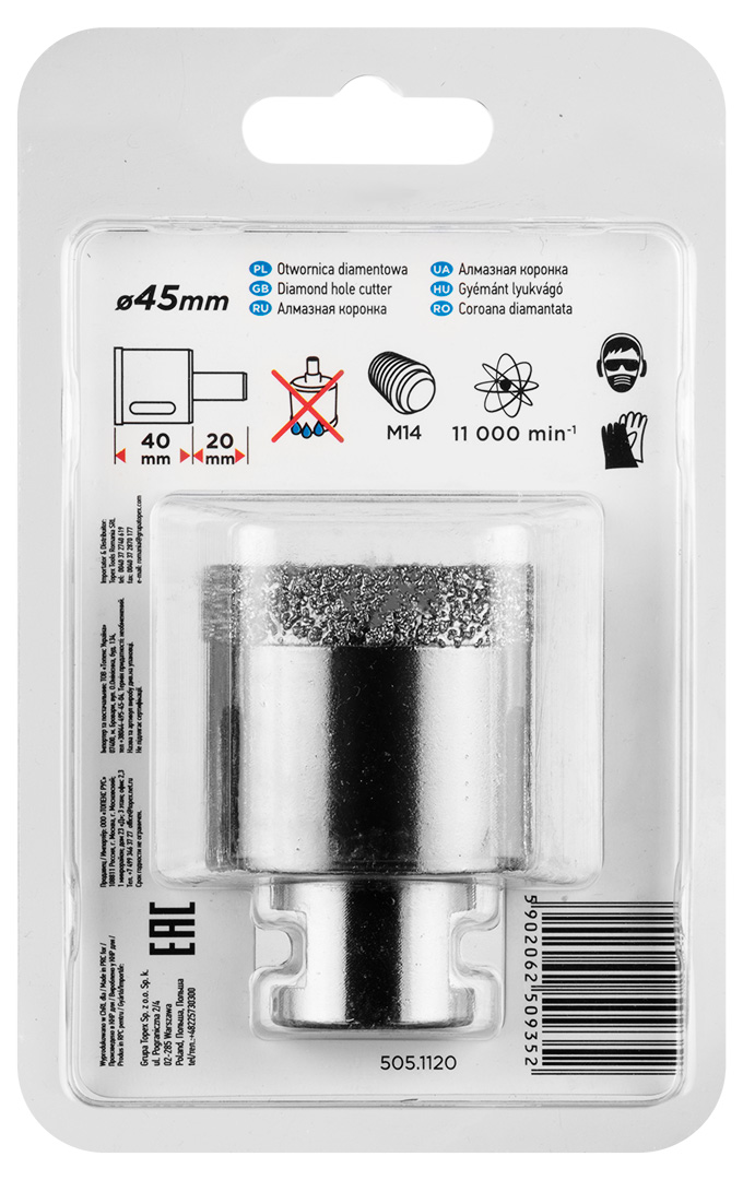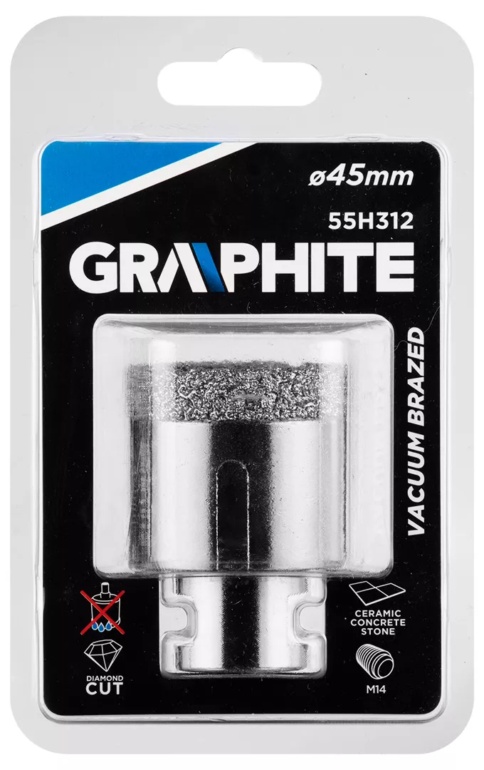 Otwornica diamentowa GRAPHITE (nr ref. 55H312) o średnicy 45 mm z gwintem M14 przeznaczona jest do precyzyjnego cięcia kamienia, gresu, płytek, szkła, asfaltu, cegły, betonu. Dzięki wykorzystaniu diamentu moc tnąca skupiona jest na niewielkim obszarze, co likwiduje ryzyko popękania lub uszkodzenia powierzchni. Nadaje się do pracy na sucho. Otwornica została zlutowana próżniowo, co zwiększą jej odporność.