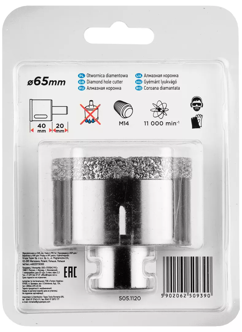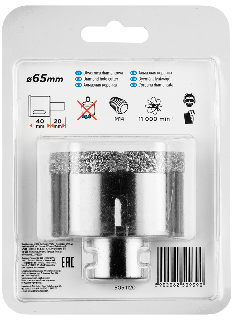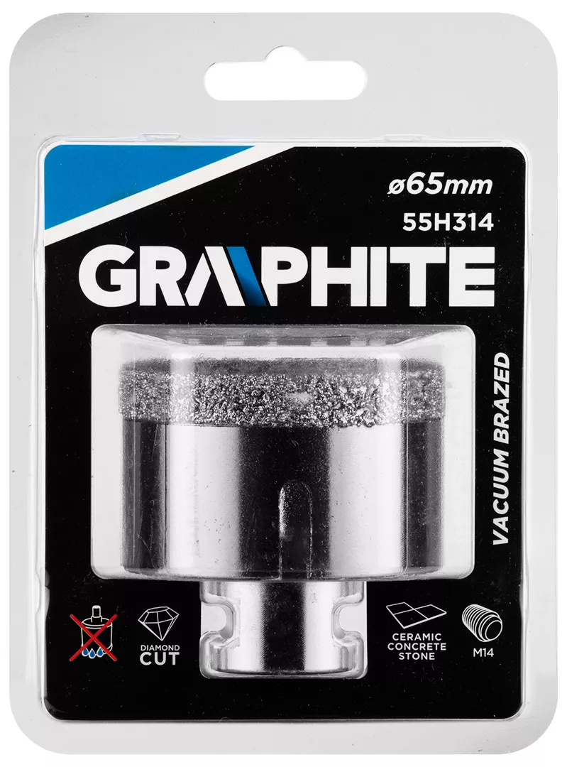 Otwornica diamentowa GRAPHITE (nr ref. 55H314) o średnicy 65 mm z gwintem M14 przeznaczona jest do precyzyjnego cięcia kamienia, gresu, płytek, szkła, asfaltu, cegły, betonu. Dzięki wykorzystaniu diamentu moc tnąca skupiona jest na niewielkim obszarze, co likwiduje ryzyko popękania lub uszkodzenia powierzchni. Nadaje się do pracy na sucho. Otwornica została zlutowana próżniowo, co zwiększą jej odporność.