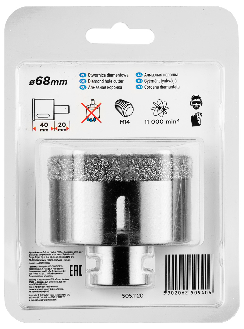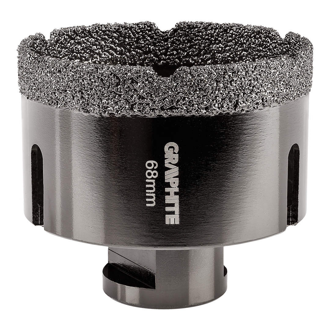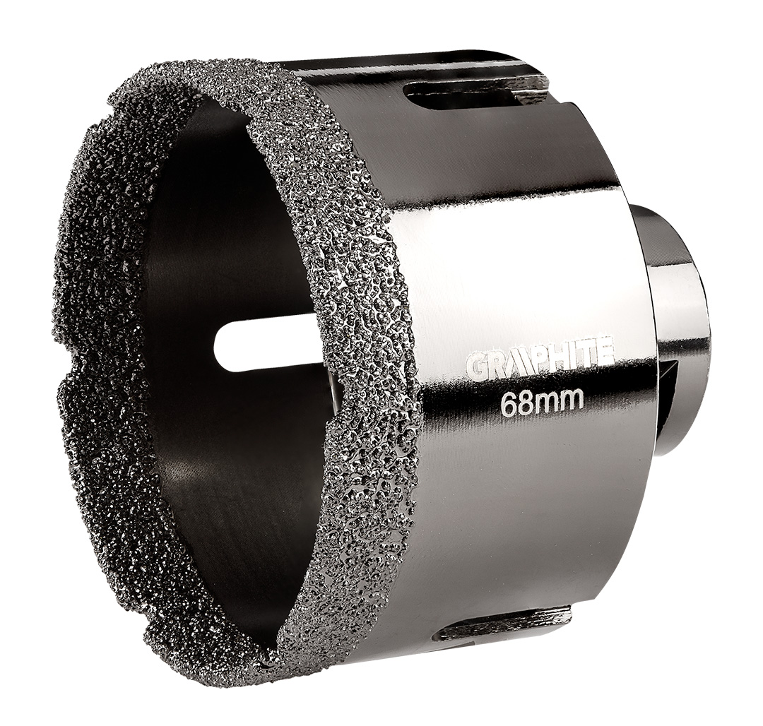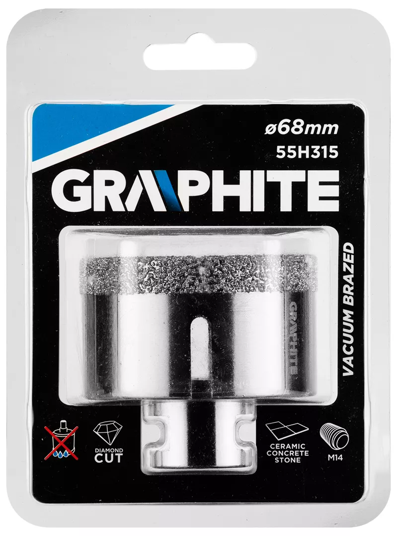 Otwornica diamentowa GRAPHITE (nr ref. 55H315) o średnicy 68 mm z gwintem M14 przeznaczona jest do precyzyjnego cięcia kamienia, gresu, płytek, szkła, asfaltu, cegły, betonu. Dzięki wykorzystaniu diamentu moc tnąca skupiona jest na niewielkim obszarze, co likwiduje ryzyko popękania lub uszkodzenia powierzchni. Nadaje się do pracy na sucho. Otwornica została zlutowana próżniowo, co zwiększą jej odporność.