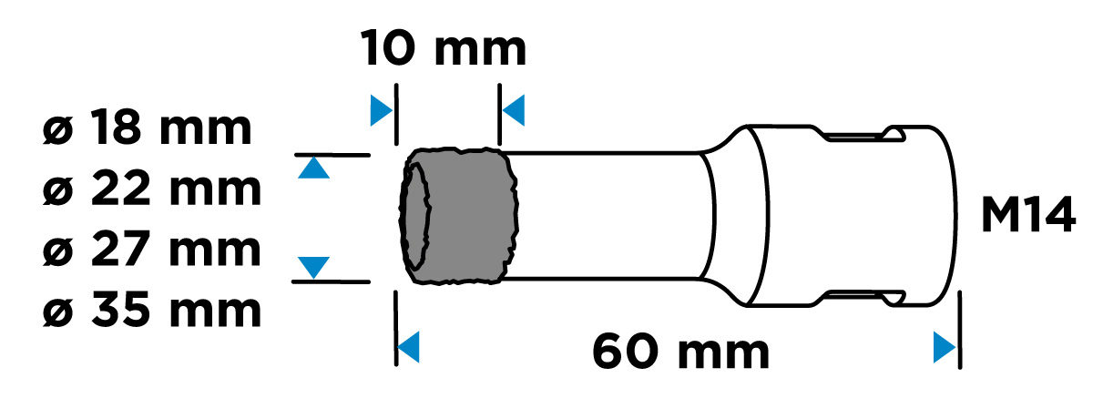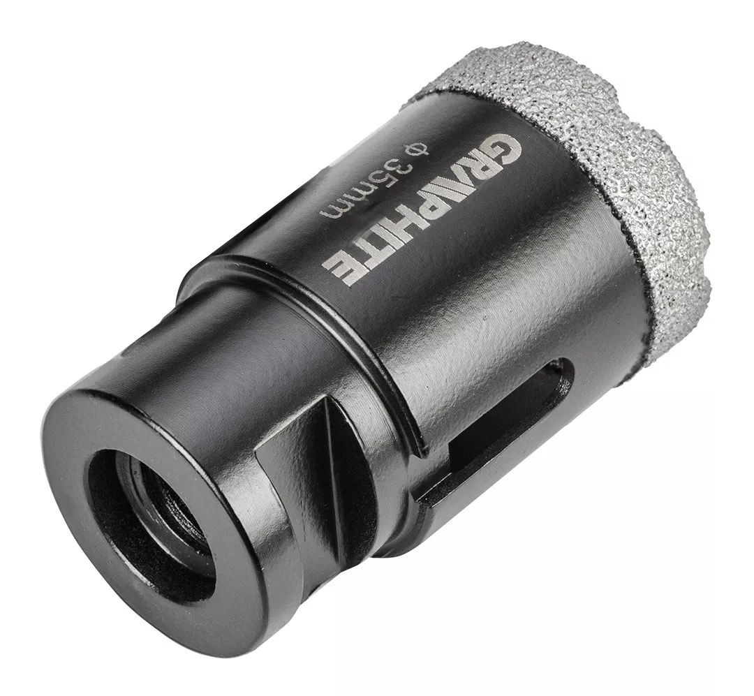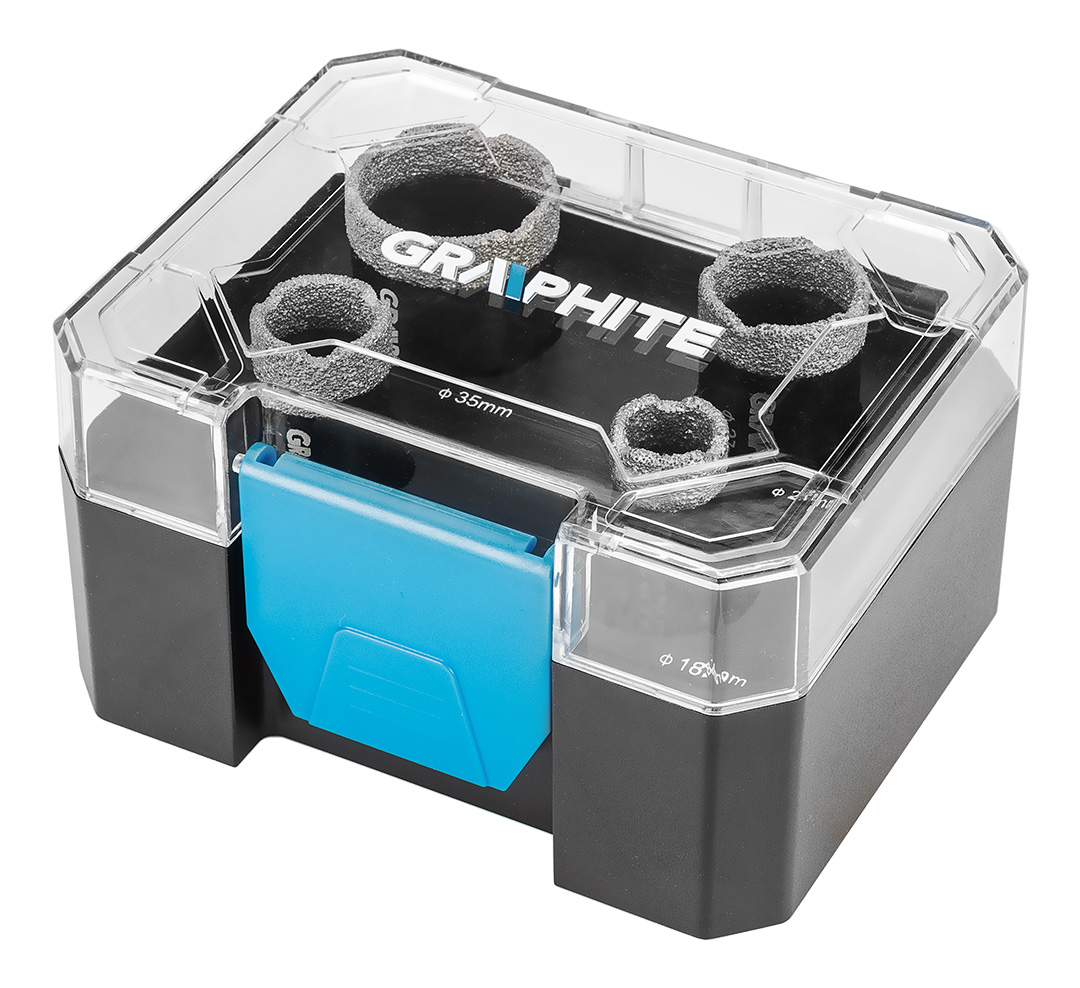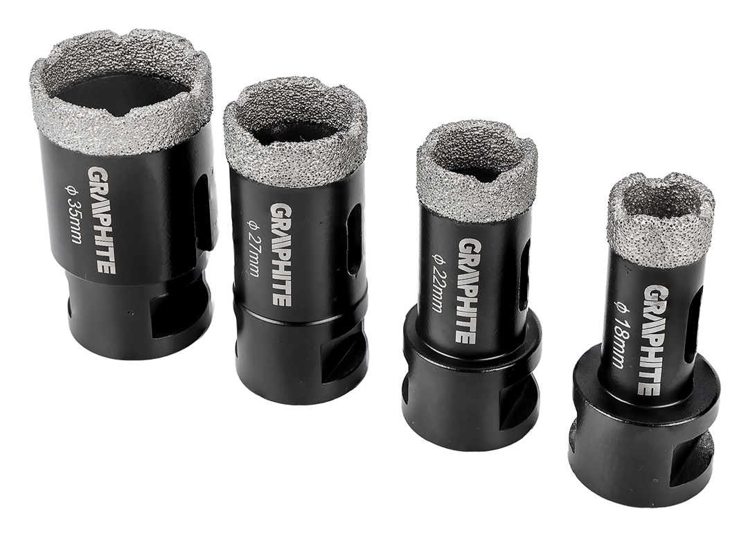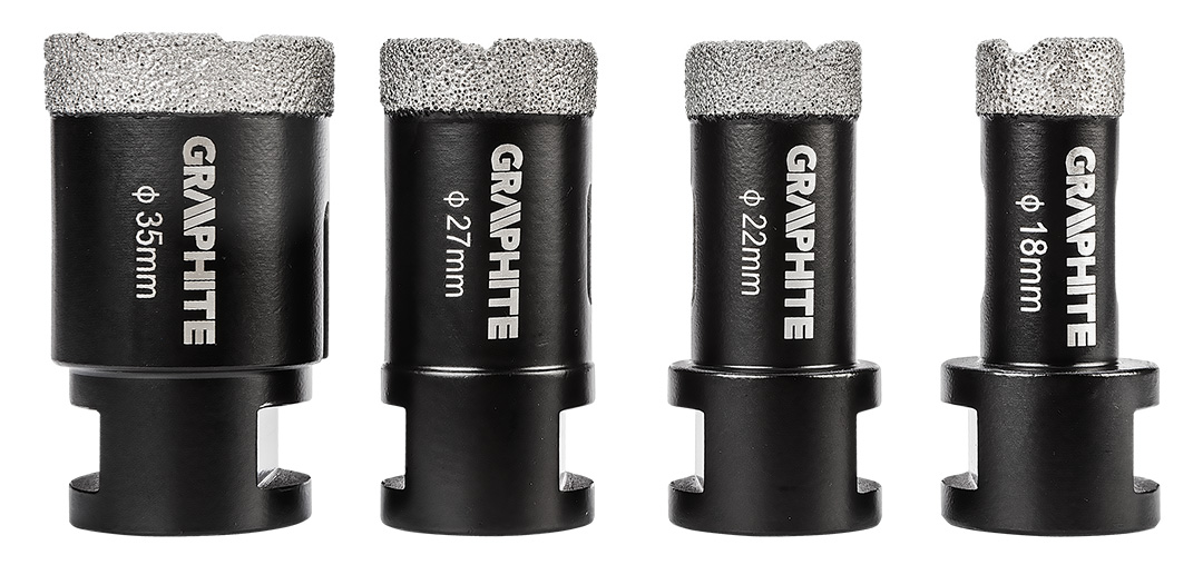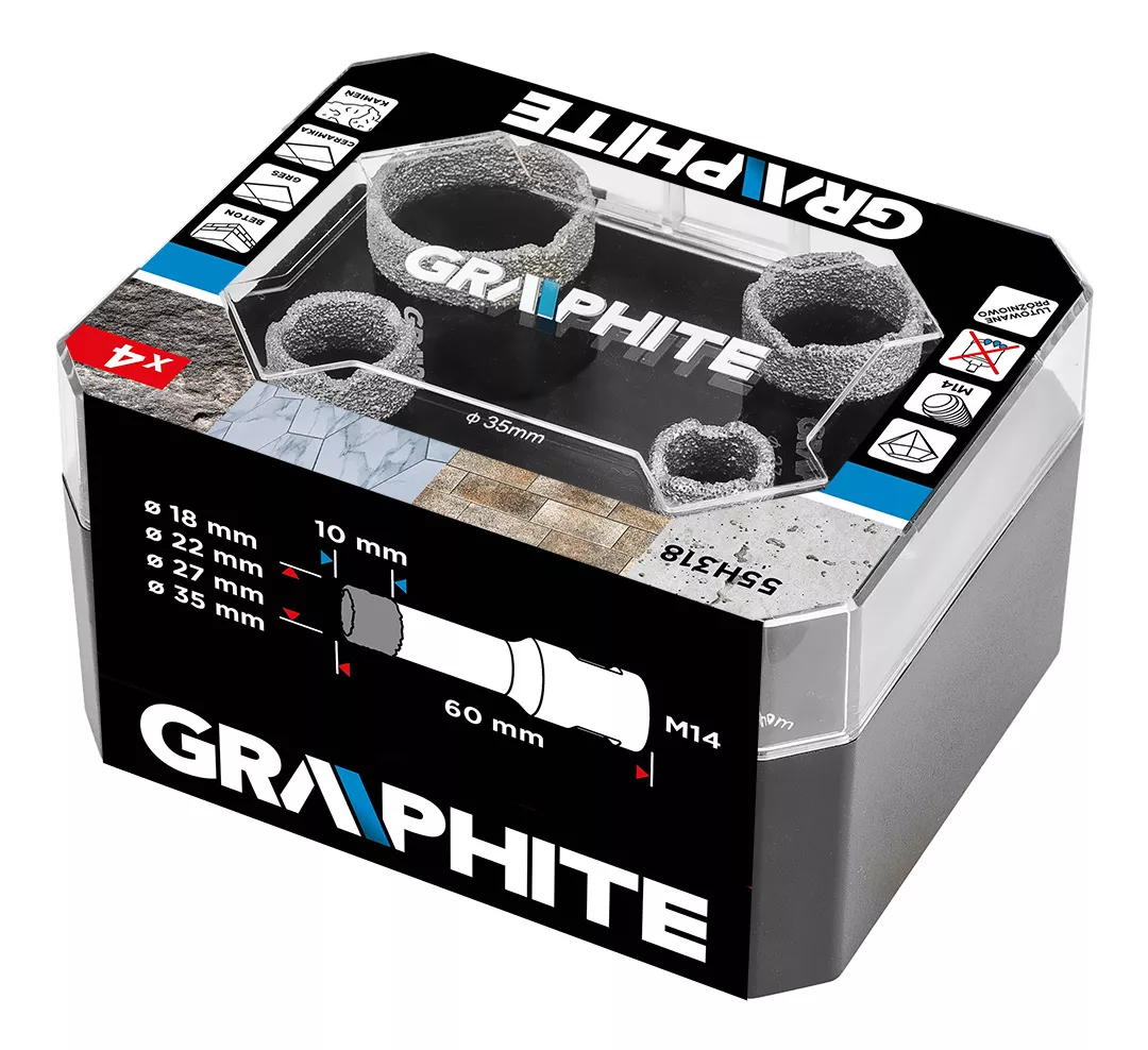 Otwornice diamentowe (18, 22, 27, 35 mm), zestaw 4 elementów 55H318 marki GRAPHITE to komplet czterech otwornic o średnicach: 18, 22, 27, 35 mm, które wykonano z solidnej stali C45. Charakteryzują się one maksymalną głębokością wiercenia 30 mm oraz prędkością do 13 000 obrotów na minutę. Dzięki uchwytowi M14 i twardości HV 175-200 są uniwersalne w zastosowaniu. Najlepiej sprawdzą się w pracy z ceramiką, gresem, betonem, klinkierem i kamieniem. Wielkość ziarna D46 oraz wysokość powłoki diamentowej 10 mm zapewniają czyste i precyzyjne cięcie nawet w wymagających warunkach. Zestaw otwornic diamentowych marki GRAPHITE polecany jest profesjonalistom jak i majsterkowiczom.