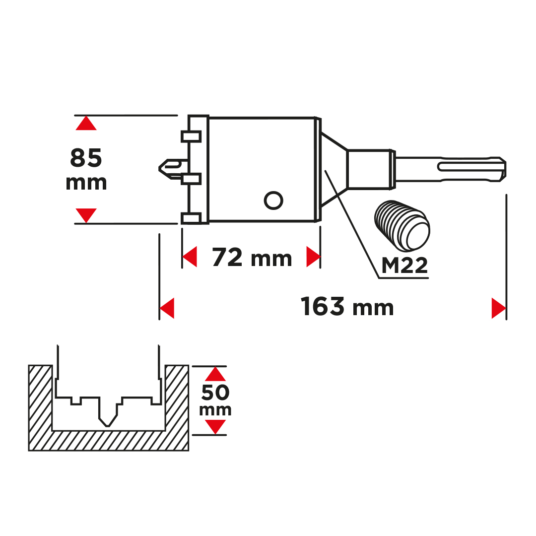 Otwornica widiowa 85 mm z adapterem SDS+ oraz wiertłem pilotującym 55H323 marki GRAPHITE charakteryzująca się średnicą otwornicy 85 mm, wysokością 72 mm i głębokością wiercenia 50 mm. Wyposażona została w 10 widii o szerokości 2,2 mm. Średnica wewnętrzna wynosi 79 mm, a parametry wiertła fi to 8 x 110 mm. Długość całego zestawu to 163 mm. Otwornica marki GRAPHITE oferowana jest w zestawie z adapterem SDS+ oraz wiertłem pilotującym. Posiada możliwość wiercenia z udarem i przeznaczona jest również do wiercenia otworów w betonie i cegle. Umożliwia przygotowywanie otworów pod puszki instalacyjne. Ostrza z drobnoziarnistego węglika spiekanego o zwiększonej odporności na ścieranie przedłużają żywotność narzędzia. Otwornica sprawdzi się w profesji budowlańca, majsterkowicza oraz elektryka.