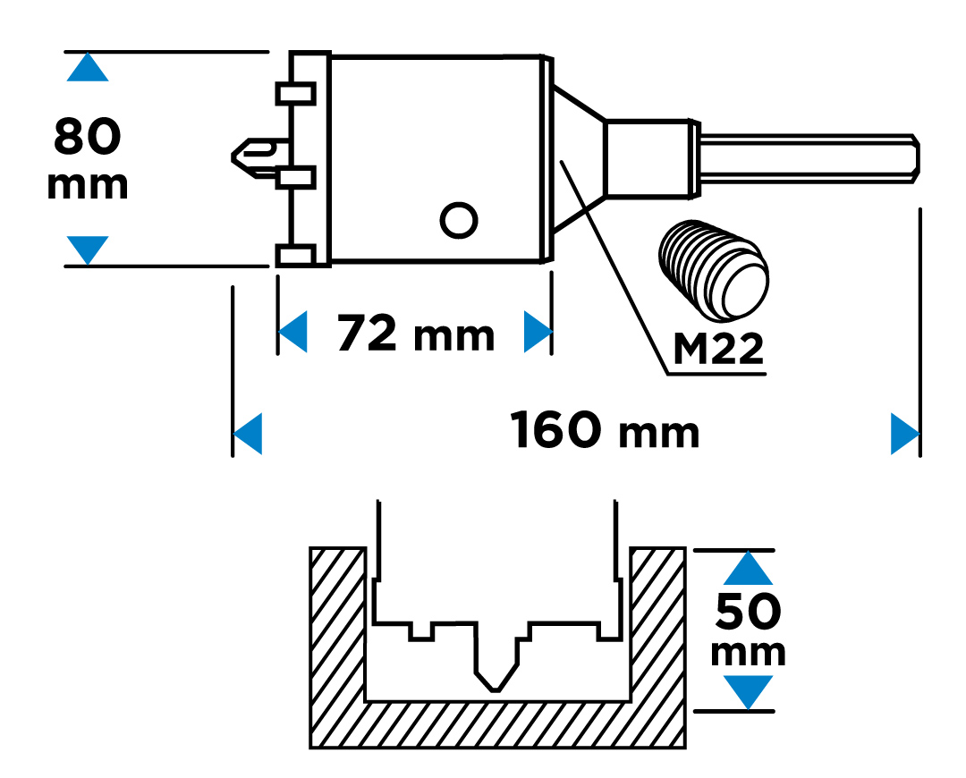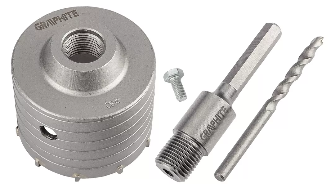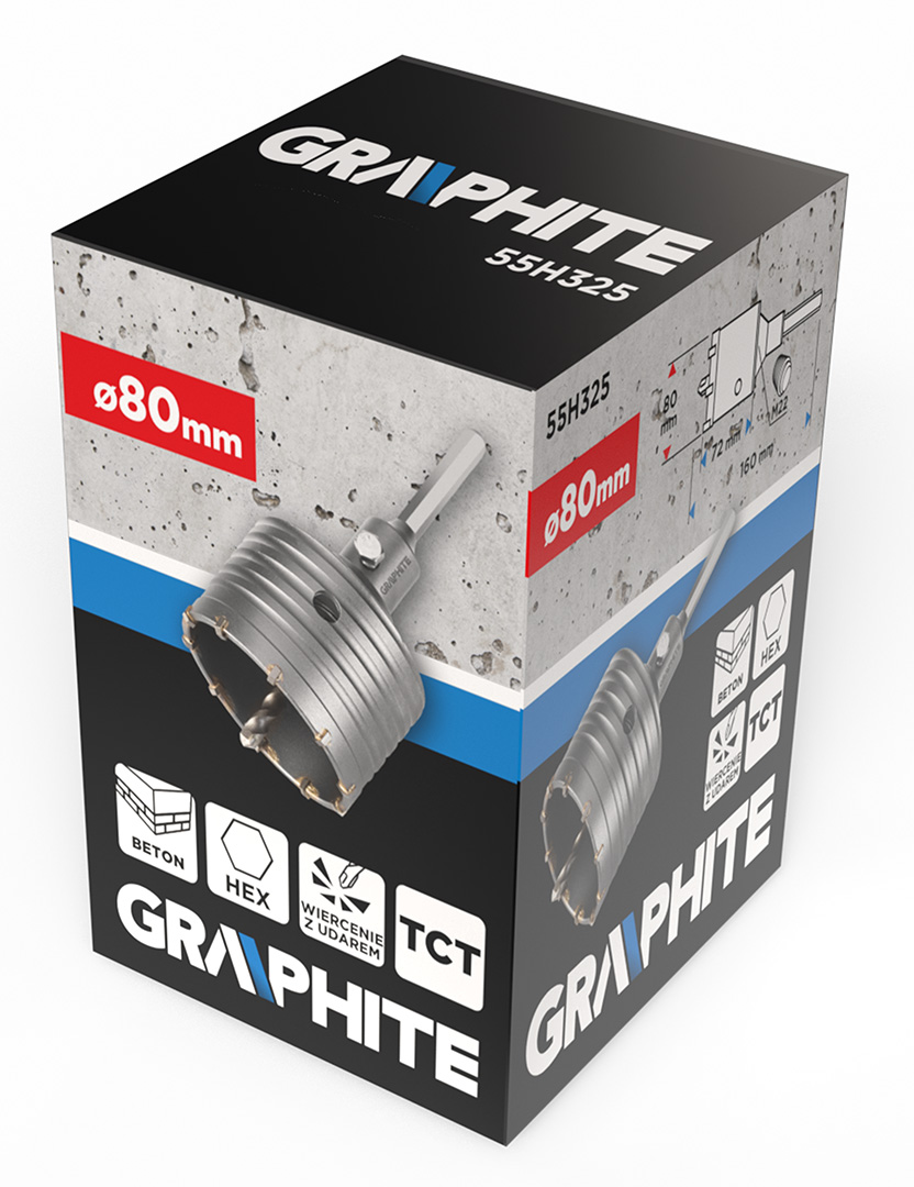 Otwornica widiowa 80 mm z adapterem Hex oraz wiertłem pilotującym 55H325 marki GRAPHITE to zestaw otwornicy widiowej oferowanej z adapterem Hex i wiertłem pilotującym, polecanym do betonu. Otwornica cechuje się średnicą 80 mm, wysokością 72 mm oraz głębokością wiercenia 80 mm. Posiada gwint M22 i została wykonana z solidnej stali TCT. Długość wiertła wynosi z kolei 110 mm, a jego średnica 8 mm. Adapter ze stali 40 Cr ma całkowitą długość 110 mm. To niezastąpiony zestaw otwornicy widiowej, z adapterem Hex i wiertłem pilotującym GRAPHITE dla profesjonalistów oraz majsterkowiczów.
