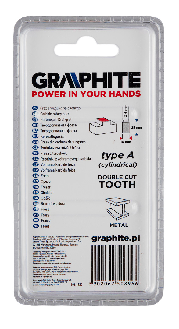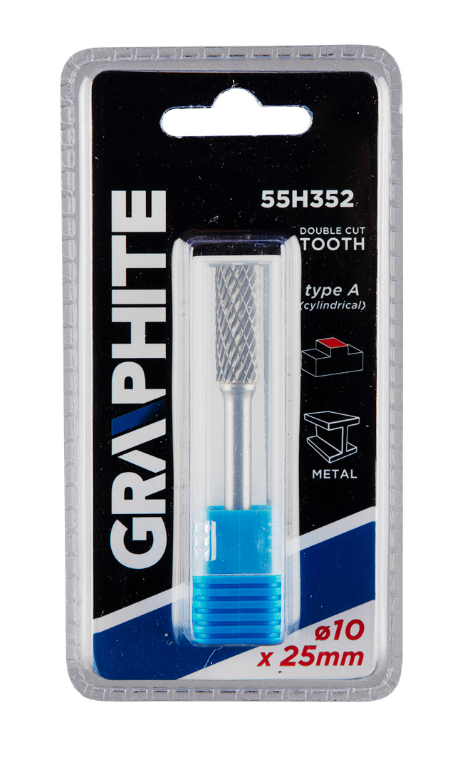 Frez do metalu GRAPHITE (nr ref. 55H352) typu A (walcowy) i rozmiarze 10 x 25 mm to narzędzie przeznaczone do szlifierki prostej służące do skrawania lub piłowania obrabianej powierzchni. Przeznaczony do prac w materiałach takich jak metal, aluminium i tworzywa sztuczne. Zastosowanie węglika spiekanego sprawia, że narzędzie ma wysoką twardość oraz odporność na zużycie ścierne. Frez ten cechuje się podwójnymi nacięciami, które pozwalają na łatwe usuwanie naddatków w obrabianych materiałach.