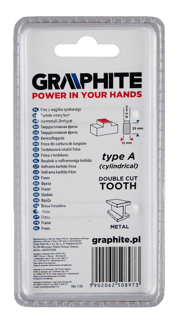 Frez do metalu GRAPHITE (nr ref. 55H353) typu A (walcowy) i rozmiarze 12 x 25 mm to narzędzie przeznaczone do szlifierki prostej służące do skrawania lub piłowania obrabianej powierzchni. Przeznaczony do prac w materiałach takich jak metal, aluminium i tworzywa sztuczne. Zastosowanie węglika spiekanego sprawia, że narzędzie ma wysoką twardość oraz odporność na zużycie ścierne. Frez ten cechuje się podwójnymi nacięciami, które pozwalają na łatwe usuwanie naddatków w obrabianych materiałach.
