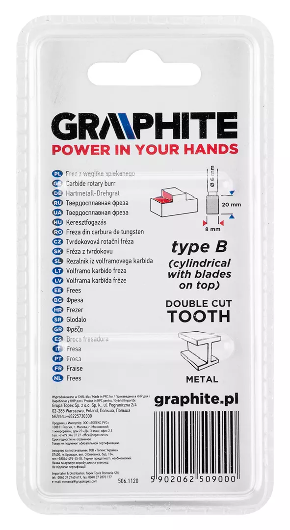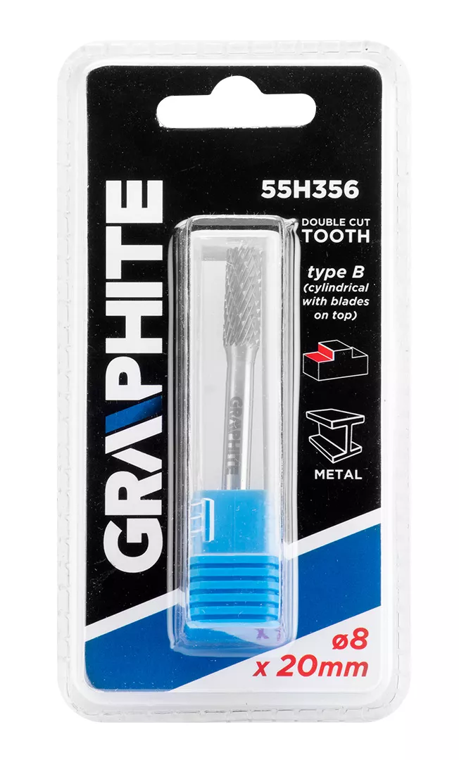 Frez do metalu GRAPHITE (nr ref. 55H356) typu B (walcowy z ostrzami na górze) i rozmiarze 8 x 20 mm to narzędzie przeznaczone do szlifierki prostej służące do skrawania lub piłowania obrabianej powierzchni. Przeznaczony do prac w materiałach takich jak metal, aluminium i tworzywa sztuczne. Zastosowanie węglika spiekanego sprawia, że narzędzie ma wysoką twardość oraz odporność na zużycie ścierne. Frez ten cechuje się podwójnymi nacięciami, które pozwalają na łatwe usuwanie naddatków w obrabianych materiałach.