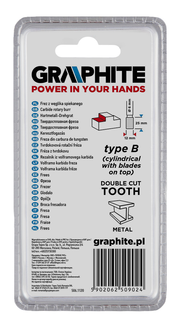 Frez do metalu GRAPHITE (nr ref. 55H359) typu B (walcowy z ostrzami na górze) i rozmiarze 16 x 25 mm to narzędzie przeznaczone do szlifierki prostej służące do skrawania lub piłowania obrabianej powierzchni. Przeznaczony do prac w materiałach takich jak metal, aluminium i tworzywa sztuczne. Zastosowanie węglika spiekanego sprawia, że narzędzie ma wysoką twardość oraz odporność na zużycie ścierne. Frez ten cechuje się podwójnymi nacięciami, które pozwalają na łatwe usuwanie naddatków w obrabianych materiałach.