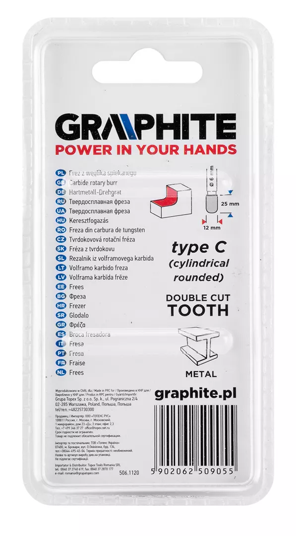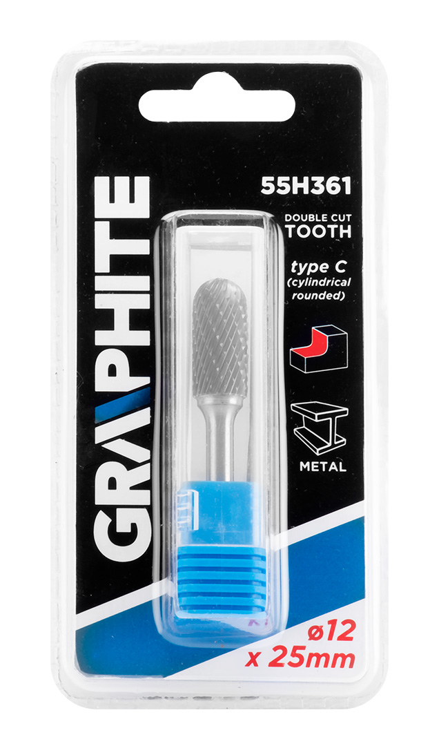 Frez do metalu GRAPHITE (nr ref. 55H361) typu C (walcowy zaokrąglony) i rozmiarze 12 x 25 mm to narzędzie przeznaczone do szlifierki prostej służące do skrawania lub piłowania obrabianej powierzchni. Przeznaczony do prac w materiałach takich jak metal, aluminium i tworzywa sztuczne. Zastosowanie węglika spiekanego sprawia, że narzędzie ma wysoką twardość oraz odporność na zużycie ścierne. Frez ten cechuje się podwójnymi nacięciami, które pozwalają na łatwe usuwanie naddatków w obrabianych materiałach.