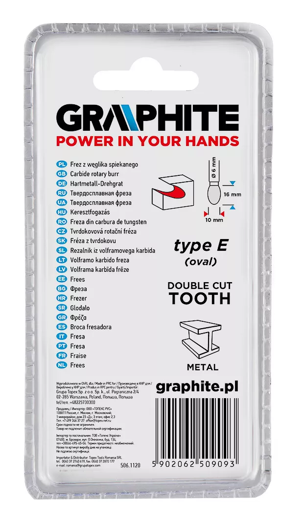 Frez do metalu GRAPHITE (nr ref. 55H365) typu E (owalny) i rozmiarze 10 x 16 mm to narzędzie przeznaczone do szlifierki prostej służące do skrawania lub piłowania obrabianej powierzchni. Przeznaczony do prac w materiałach takich jak metal, aluminium i tworzywa sztuczne. Zastosowanie węglika spiekanego sprawia, że narzędzie ma wysoką twardość oraz odporność na zużycie ścierne. Frez ten cechuje się podwójnymi nacięciami, które pozwalają na łatwe usuwanie naddatków w obrabianych materiałach.