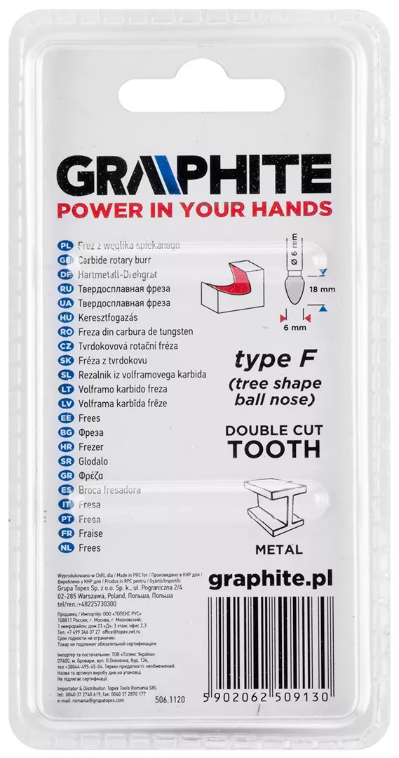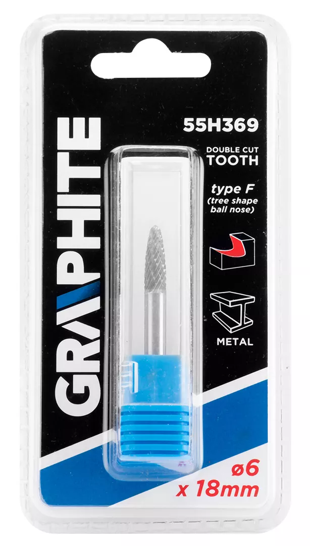 Frez do metalu GRAPHITE (nr ref. 55H369) typu F (ostrołukowy zaokrąglony) i rozmiarze 6 x18 mm to narzędzie przeznaczone do szlifierki prostej służące do skrawania lub piłowania obrabianej powierzchni. Przeznaczony do prac w materiałach takich jak metal, aluminium i tworzywa sztuczne. Zastosowanie węglika spiekanego sprawia, że narzędzie ma wysoką twardość oraz odporność na zużycie ścierne. Frez ten cechuje się podwójnymi nacięciami, które pozwalają na łatwe usuwanie naddatków w obrabianych materiałach.