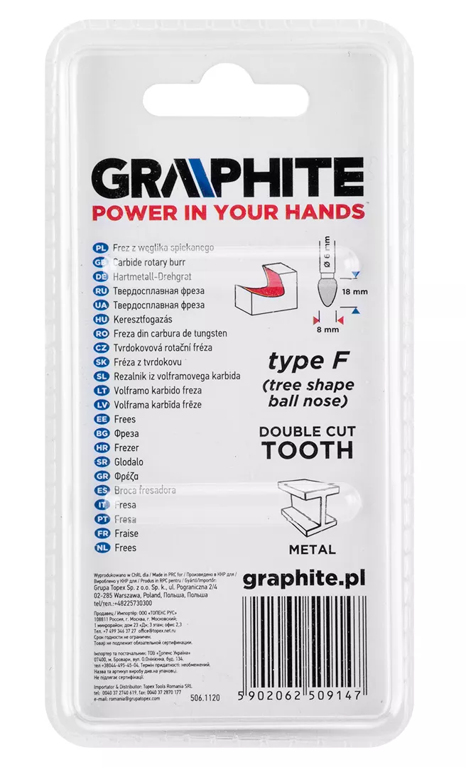Frez do metalu GRAPHITE (nr ref. 55H370) typu F (ostrołukowy zaokrąglony) i rozmiarze 8 x 18 mm to narzędzie przeznaczone do szlifierki prostej służące do skrawania lub piłowania obrabianej powierzchni. Przeznaczony do prac w materiałach takich jak metal, aluminium i tworzywa sztuczne. Zastosowanie węglika spiekanego sprawia, że narzędzie ma wysoką twardość oraz odporność na zużycie ścierne. Frez ten cechuje się podwójnymi nacięciami, które pozwalają na łatwe usuwanie naddatków w obrabianych materiałach.