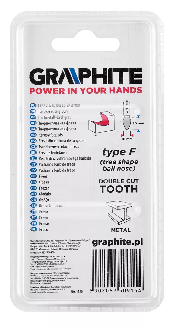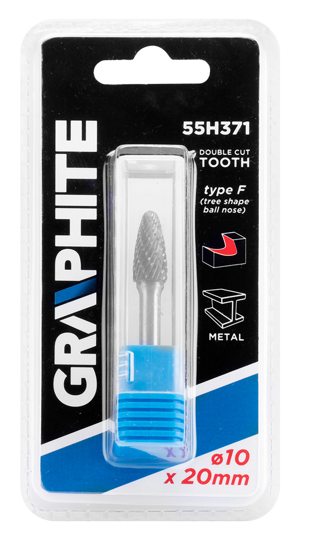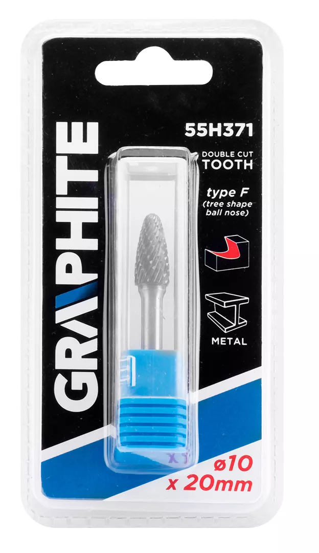 Frez do metalu GRAPHITE (nr ref. 55H371) typu F (ostrołukowy zaokrąglony) i rozmiarze 10 x 20 mm to narzędzie przeznaczone do szlifierki prostej służące do skrawania lub piłowania obrabianej powierzchni. Przeznaczony do prac w materiałach takich jak metal, aluminium i tworzywa sztuczne. Zastosowanie węglika spiekanego sprawia, że narzędzie ma wysoką twardość oraz odporność na zużycie ścierne. Frez ten cechuje się podwójnymi nacięciami, które pozwalają na łatwe usuwanie naddatków w obrabianych materiałach.