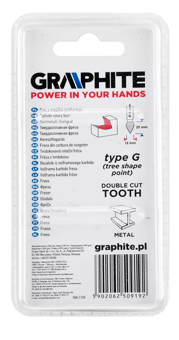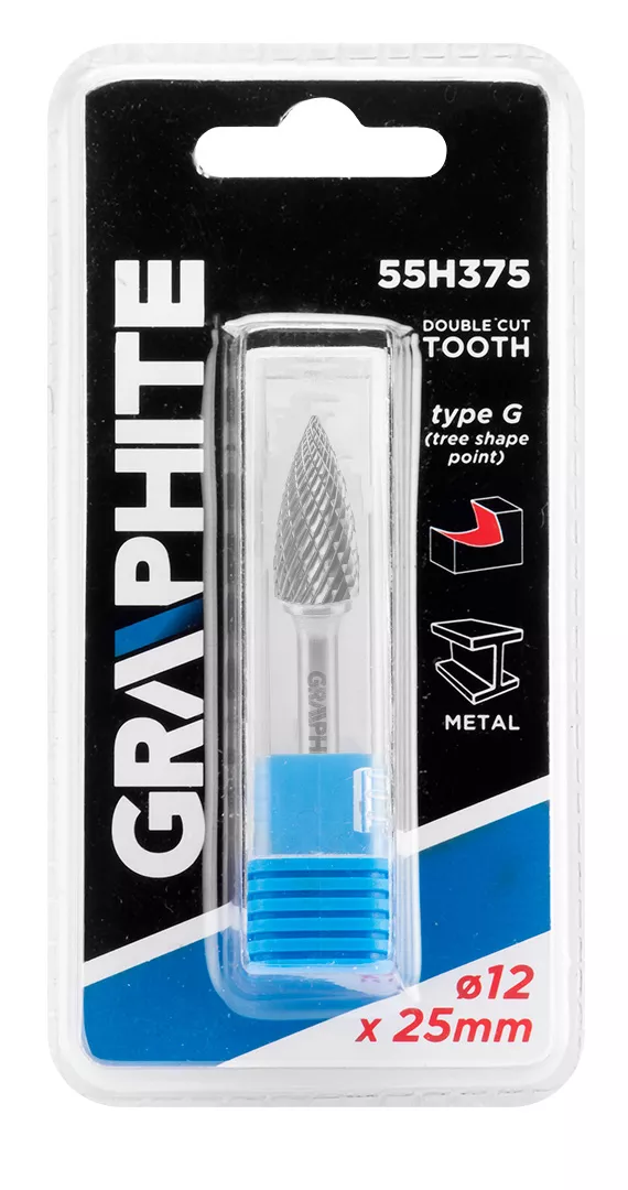 Frez do metalu GRAPHITE (nr ref. 55H375) typu G (ostrołukowy ostry) i rozmiarze 12 x 25 mm to narzędzie przeznaczone do szlifierki prostej służące do skrawania lub piłowania obrabianej powierzchni. Przeznaczony do prac w materiałach takich jak metal, aluminium i tworzywa sztuczne. Zastosowanie węglika spiekanego sprawia, że narzędzie ma wysoką twardość oraz odporność na zużycie ścierne. Frez ten cechuje się podwójnymi nacięciami, które pozwalają na łatwe usuwanie naddatków w obrabianych materiałach.