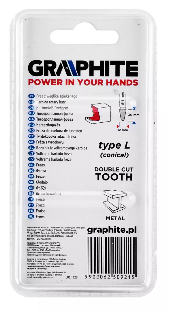 Frez do metalu GRAPHITE (nr ref. 55H377) typu L (stożkowy) i rozmiarze 12 x 30 mm to narzędzie przeznaczone do szlifierki prostej służące do skrawania lub piłowania obrabianej powierzchni. Przeznaczony do prac w materiałach takich jak metal, aluminium i tworzywa sztuczne. Zastosowanie węglika spiekanego sprawia, że narzędzie ma wysoką twardość oraz odporność na zużycie ścierne. Frez ten cechuje się podwójnymi nacięciami, które pozwalają na łatwe usuwanie naddatków w obrabianych materiałach.