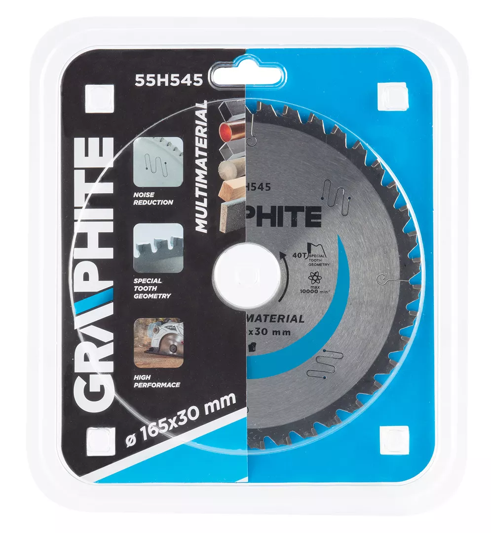 Tarcza do pilarki widiowa GRAPHITE (nr ref. 55H545), o średnicy zewnętrznej 165 mm i wewnętrznej 30 mm, posiada 40 zębów, pozwala uzyskiwać wyższą prędkość cięcia. Tarcza bazująca na specjalnej konstrukcji uzębienia oraz zastosowaniu specjalnych węglików spiekanych. Uniwersalna tarcza, której nie trzeba wymieniać przy zmianie ciętego materiału. Zęby FWF dzięki swojej specjalnej konstrukcji i szerokiej części grzebieniowej dają gwarancje wytrzymałości na obciążenia. Przeznaczona do cięć różnych rodzajów materiałów np.: profili stalowych i aluminiowych oraz innych metali kolorowych, takich jak miedź, tworzywa sztuczne, drewno z małymi gwoździami, płyt OSB, sklejek, gałęzi, laminatów itp. Zastosowanie nacięć kompensacyjnych redukuje poziom hałasu, a szczeliny zwiększają stabilność tarczy oraz dokładność cięcia. Tarcza widiowa zapewnia czyste cięcie.