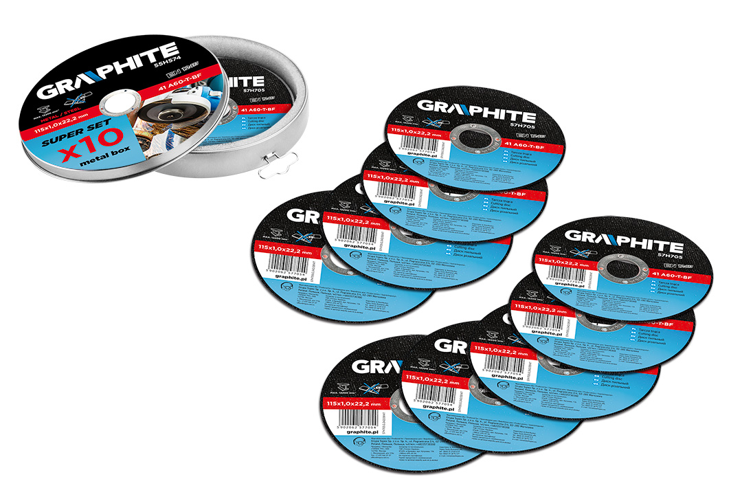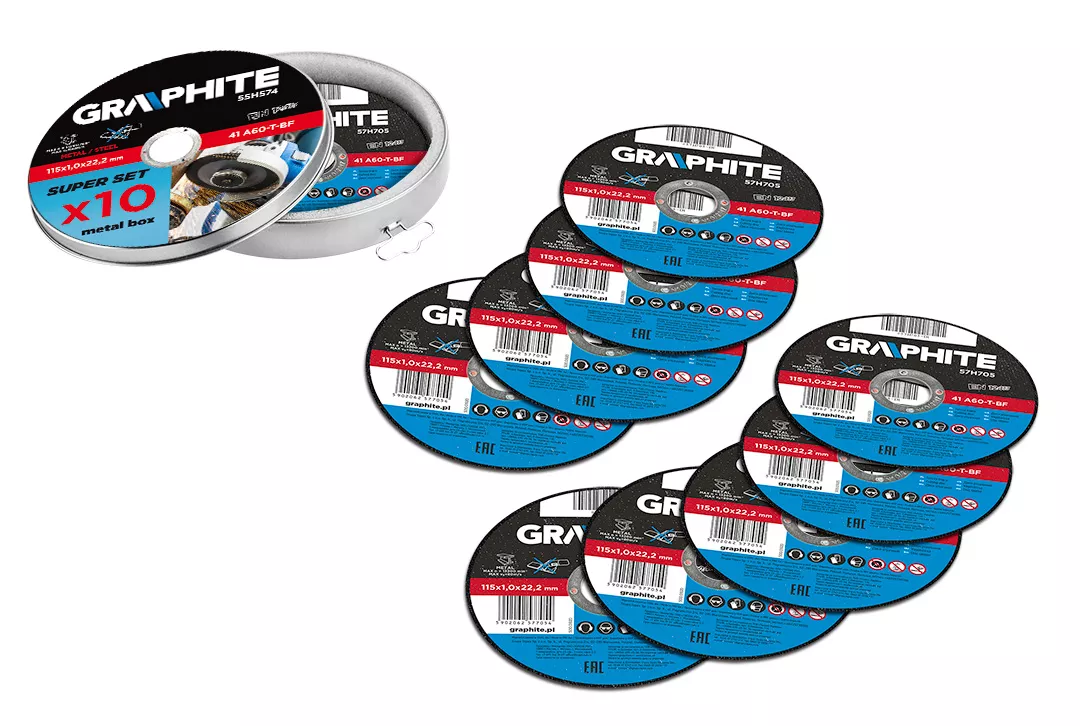 Tarcze do cięcia metalu GRAPHITE (nr ref. 55H574) o średnicy zewnętrznej 115 mm, dzięki zaawansowanej konstrukcji i redukcji grubości pozwala znacząco skrócić czas cięcia. Zapewnia wysoki poziom bezpieczeństwa pracy dzięki zgodności produktu z normą EN12413.