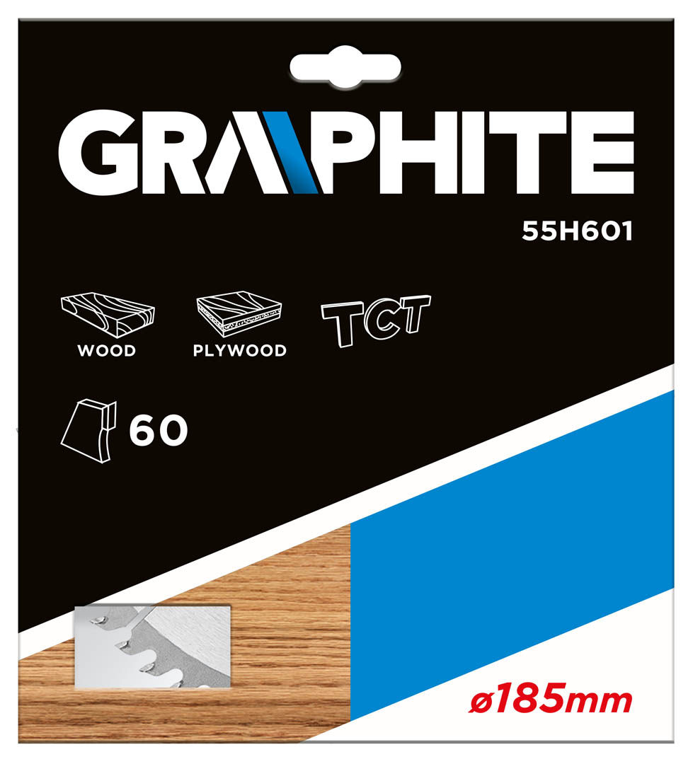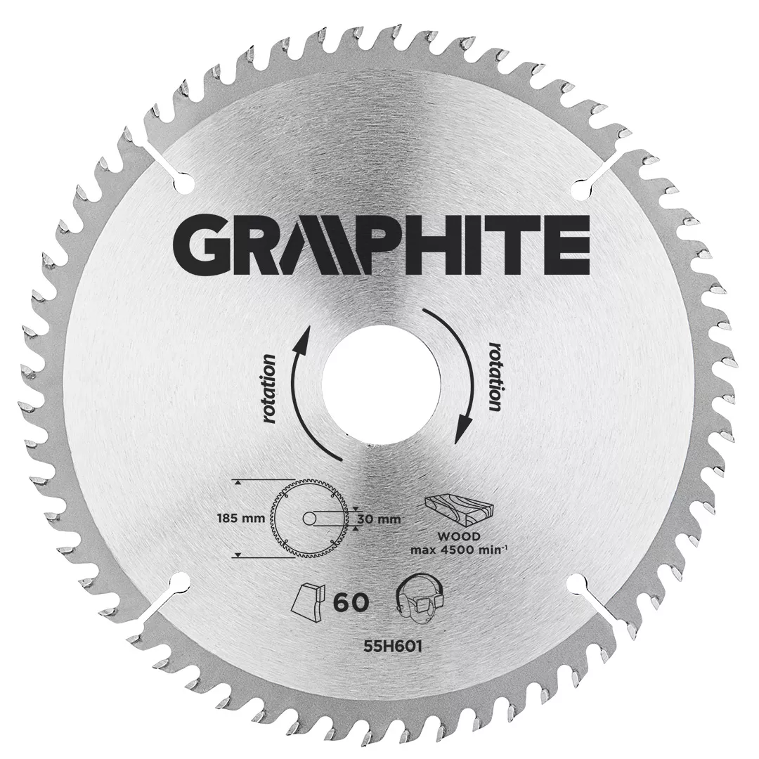 Tarcza do pilarki widiowa GRAPHITE (nr ref. 55H601 ) o średnicy zewnętrznej 185 mm, wykonana ze stopu stali manganowej MN65 o dużej odporności na temperaturę i odkształcenia. Zęby z nakładkami z węglika spiekanego YG6A pozwalają na zgrubne cięcie drewna i materiałów drewnopochodnych, takich jak sklejka, płyta wiórowa, MDF. Zawarte w opakowaniu pierścienie redukcyjne umożliwiają zastosowanie tarczy do większości modeli pilarek.