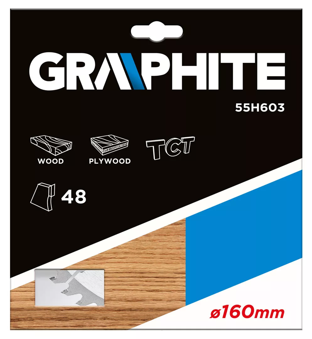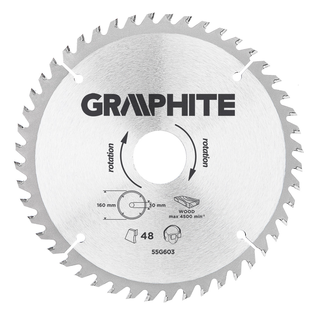 Tarcza do pilarki widiowa GRAPHITE (nr ref. 55H603) o średnicy zewnętrznej 160 mm, wykonana ze stopu stali manganowej MN65 o dużej odporności na temperaturę i odkształcenia. Zęby z nakładkami z węglika spiekanego YG6A pozwalają na zgrubne cięcie drewna i materiałów drewnopochodnych, takich jak sklejka, płyta wiórowa, MDF. Zawarte w opakowaniu pierścienie redukcyjne umożliwiają zastosowanie tarczy do większości modeli pilarek.