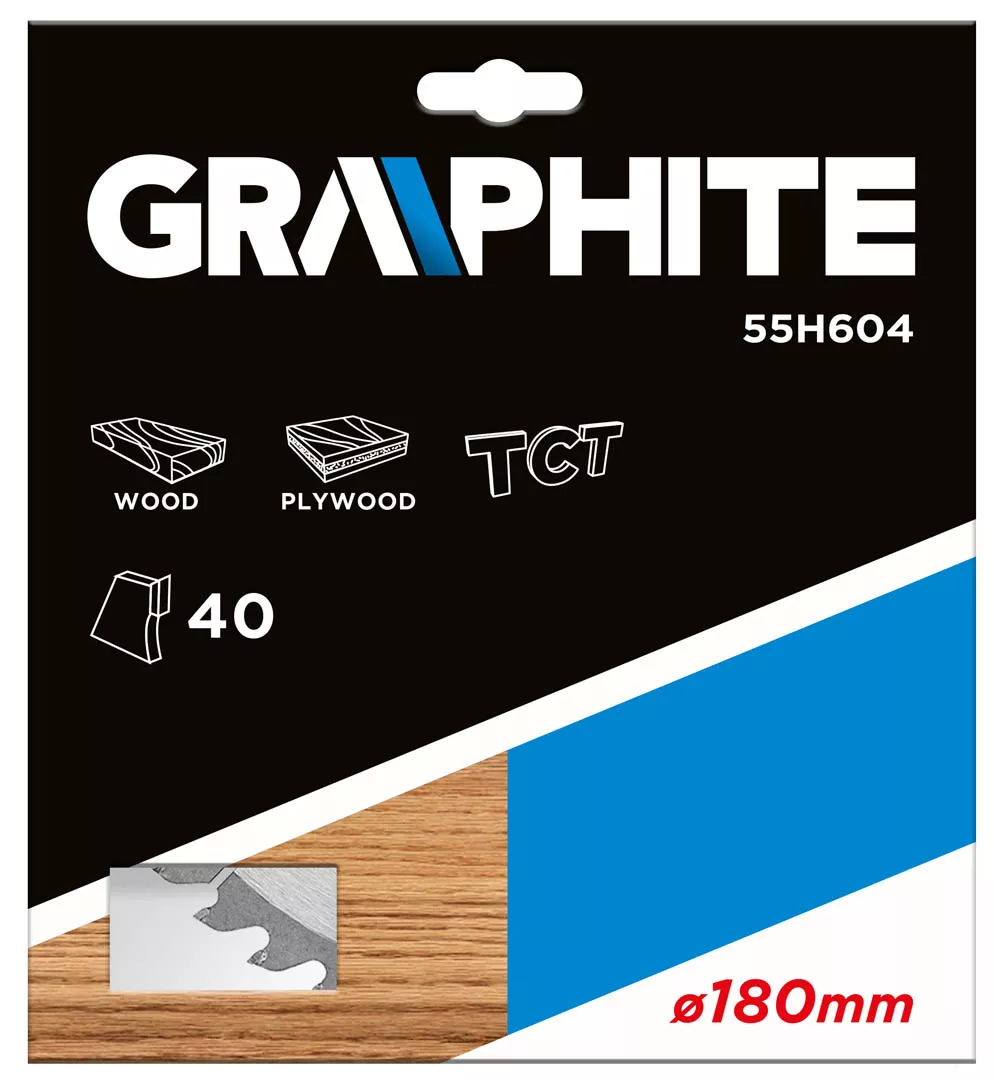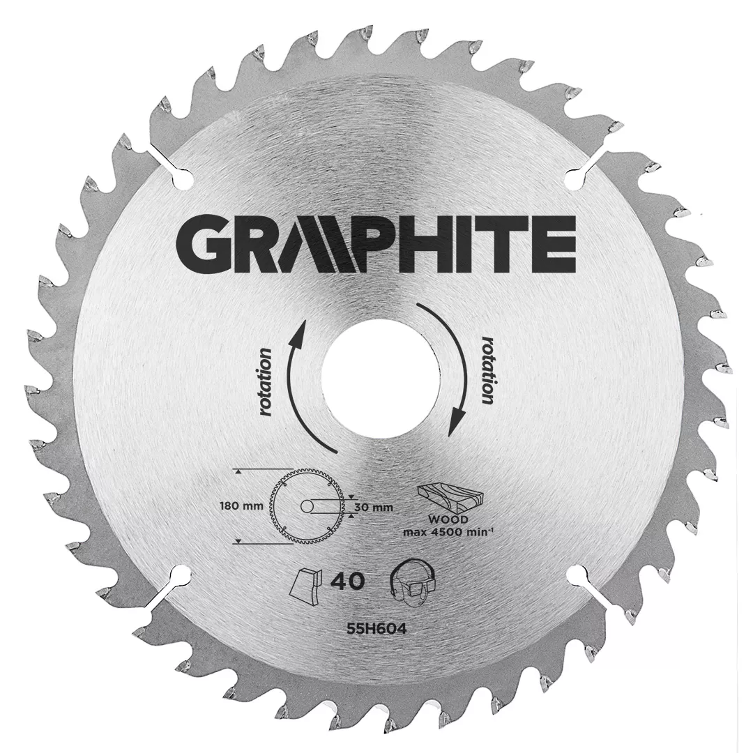 Tarcza do pilarki widiowa GRAPHITE (nr ref. 55H604) o średnicy zewnętrznej 180 mm, wykonana ze stopu stali manganowej MN65 o dużej odporności na temperaturę i odkształcenia. Zęby z nakładkami z węglika spiekanego YG6A pozwalają na zgrubne cięcie drewna i materiałów drewnopochodnych, takich jak sklejka, płyta wiórowa, MDF. Zawarte w opakowaniu pierścienie redukcyjne umożliwiają zastosowanie tarczy do większości modeli pilarek.