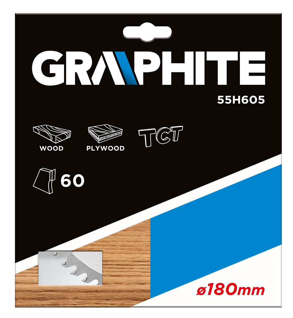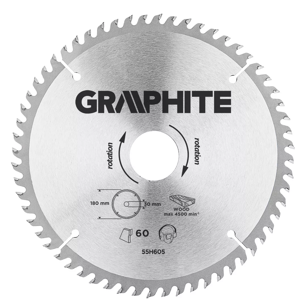 Tarcza do pilarki widiowa GRAPHITE (nr ref. 55H605) o średnicy zewnętrznej 180 mm, wykonana ze stopu stali manganowej MN65 o dużej odporności na temperaturę i odkształcenia. Zęby z nakładkami z węglika spiekanego YG6A pozwalają na zgrubne cięcie drewna i materiałów drewnopochodnych, takich jak sklejka, płyta wiórowa, MDF. Zawarte w opakowaniu pierścienie redukcyjne umożliwiają zastosowanie tarczy do większości modeli pilarek.