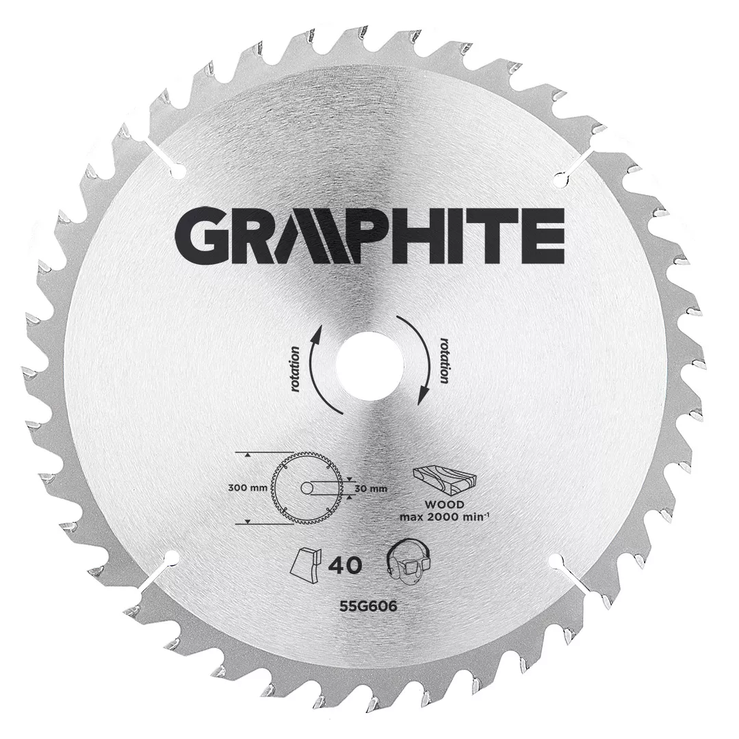 Tarcza do pilarki widiowa GRAPHITE (nr ref. 55H606) o średnicy zewnętrznej 300 mm, wykonana ze stopu stali manganowej MN65 o dużej odporności na temperaturę i odkształcenia. Zęby z nakładkami z węglika spiekanego YG6A pozwalają na zgrubne cięcie drewna i materiałów drewnopochodnych, takich jak sklejka, płyta wiórowa, MDF. Zawarte w opakowaniu pierścienie redukcyjne umożliwiają zastosowanie tarczy do większości modeli pilarek.