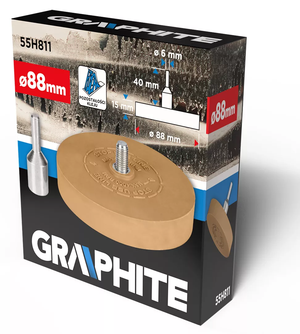 Tarcza do usuwania kleju 88 mm 55H811 marki GRAPHITE to skuteczne narzędzie o średnicy 88 mm i grubości 15 mm, przeznaczona do profesjonalnego oraz amatorskiego usuwania naklejek i pozostałości kleju z karoserii auta. Tarcza została wykonana z solidnej, ale także delikatnej gumy, która nie rysuje powierzchni. Charakteryzuje się maksymalną prędkością obrotową 4000 obrotów na minutę. Sprawdzi się nie tylko w zastosowaniach motoryzacyjnych.