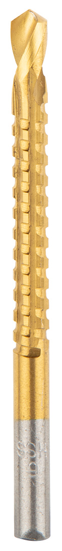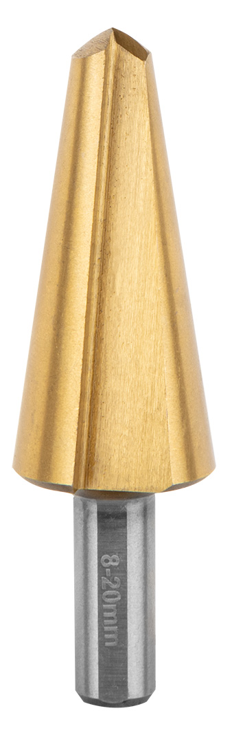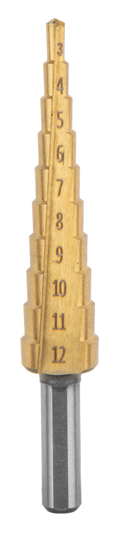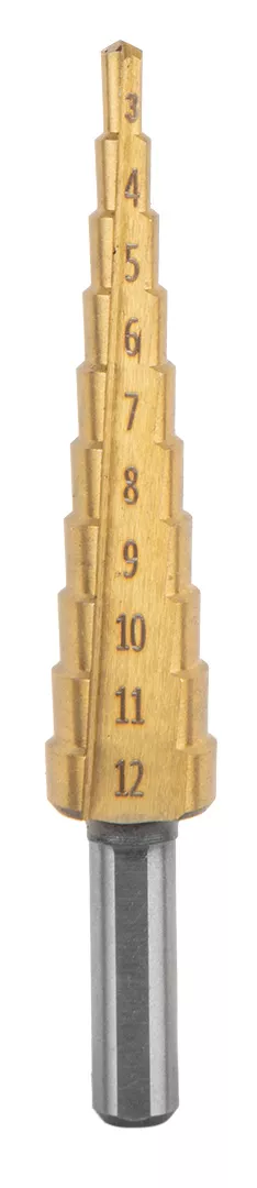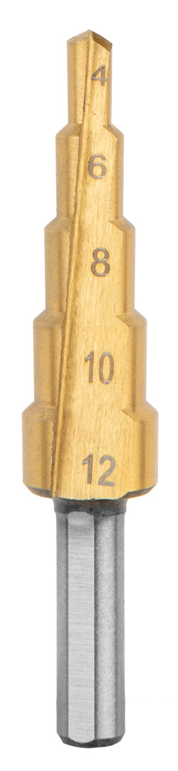 Wiertła stopniowe, rozwiertaki, frezowiertła, pogłębiacz, zestaw 7 szt., 2 wiertła stopniowe: 4-12 mm, 3-12 mm, wiertło bezstopniowe 8-20 mm, 3 wiertła typu piła: 4, 5, 6 mm, pogłębiacz: 12.4 mm, materiał wykonania: stal HSS, zastosowanie: do metalu, sklejki, materiałów sztucznych, drewna, w kasecie z tworzywa sztucznego.