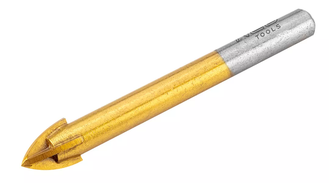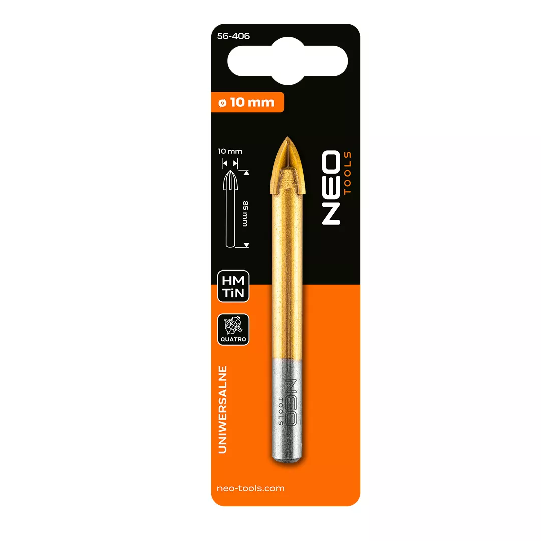 Wiertło uniwersalne HM, średnica 10 mm, długość całkowita 85 mm, max. prędkość obrotowa 1000 obr/min., uchwyt cylindryczny, powłoka TiN, 4 ostrza z węglika spiekanego, przeznaczone do wiercenia bezudarowego, zastosowanie: do tworzywa sztuczne, aluminium, cegła, ceramika, szkło
