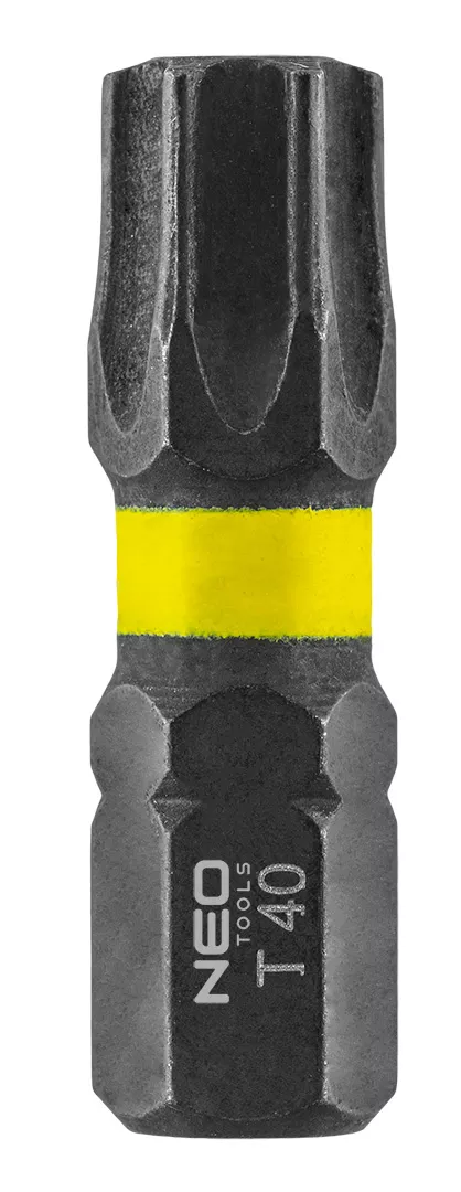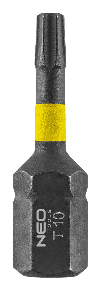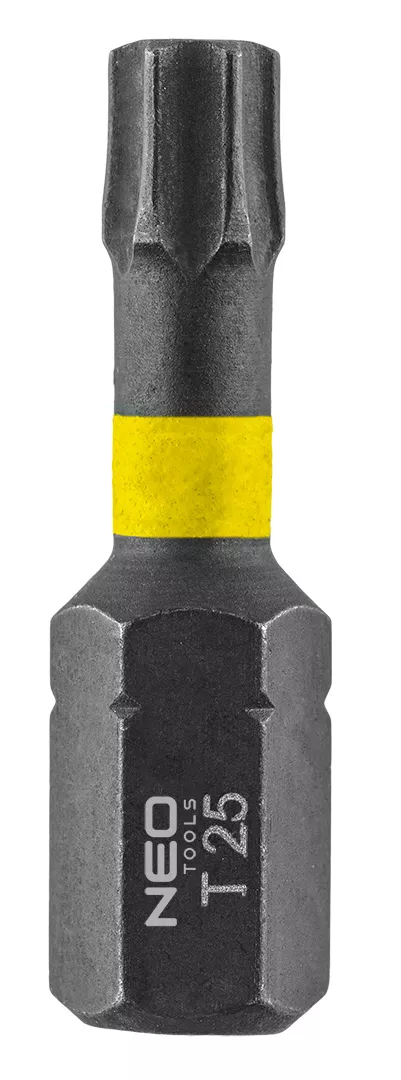 Bity udarowe TX10/15/20/25/30/40 x 25 mm, 6 sztuk 56-541 marki NEO TOOLS typu TX10, TX15, TX20, TX25, TX30, TX40 o długości 25 mm. Wyposażone w uchwyt ¼” HEX oraz polecane do ciężkich prac z zastosowaniem wysokich momentów obrotowych, przy użyciu wkrętarek lub zakrętarek udarowych. Bity udarowe wykonane zostały z trwałej stali S2. W zestawie oferowanych jest 6 sztuk - dla profesjonalistów i majsterkowiczów.