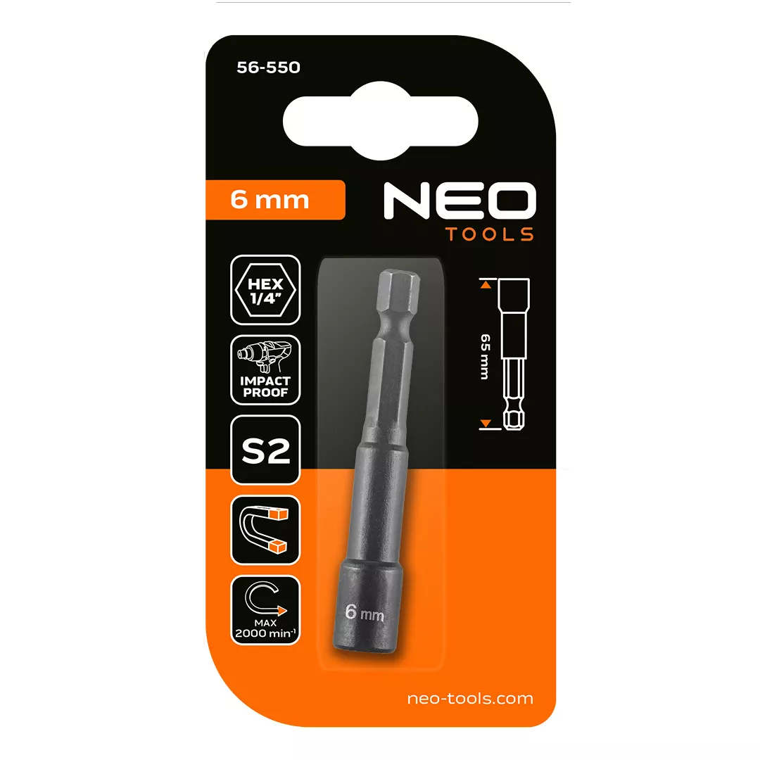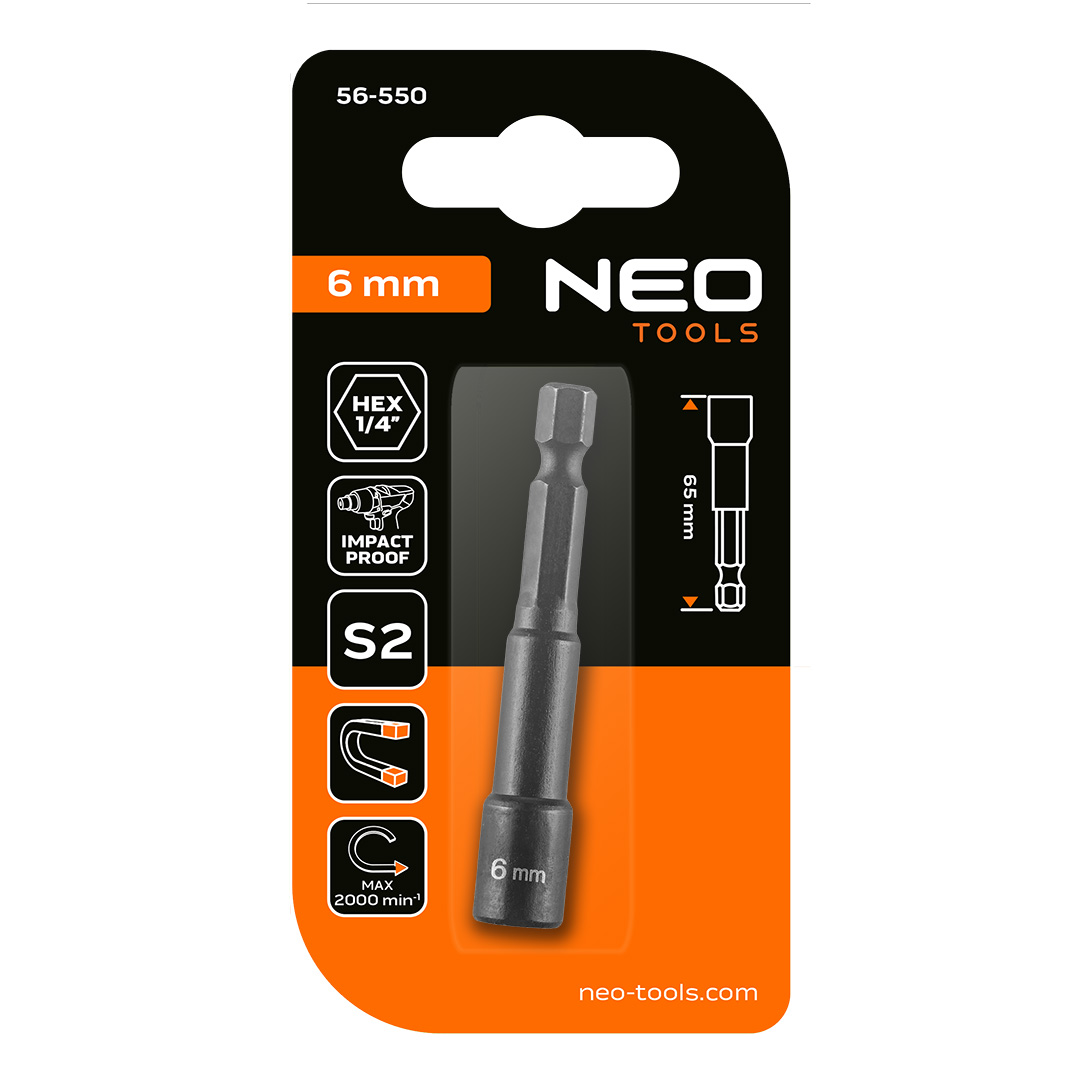Nasadka udarowa 6 mm, magnetyczna, długość całkowita 65 mm, uchtywt 1/4" HEX, stal S2, maksymalna prędkość obrotowa 2 000 obr/min.