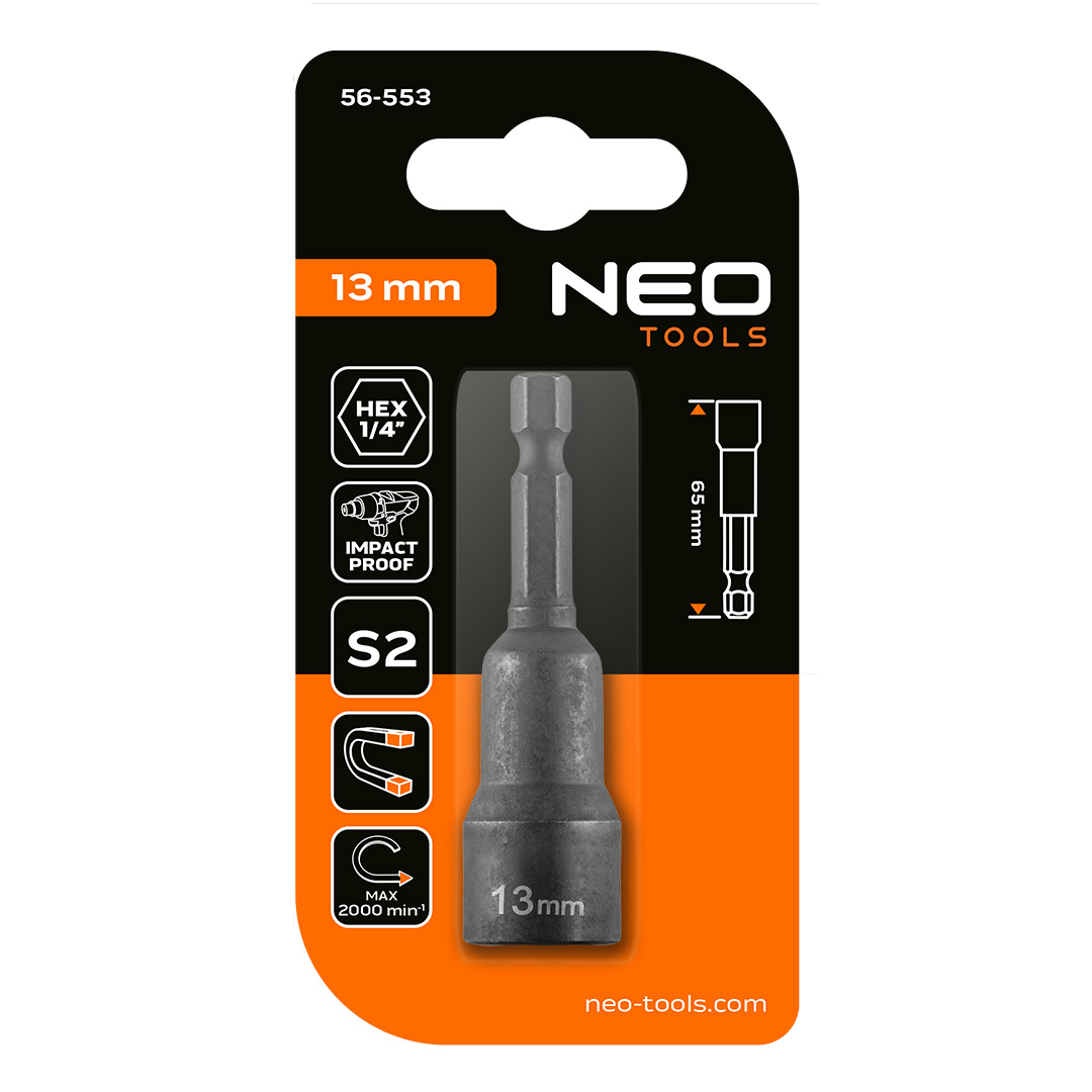 Nasadka udarowa 13 mm, magnetyczna, długość całkowita 65 mm, uchtywt 1/4" HEX, stal S2, maksymalna prędkość obrotowa 2 000 obr/min.