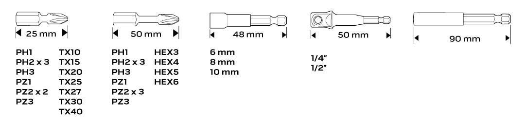 Zestaw bitów udarowych, 36 sztuk 56-560 marki NEO TOOLS wykonano ze stali S2 i skompletowano pod najczęstsze zastosowania montażowe. W skład zestawu wchodzą bity 25 mm: PH1/2/2/2/3, PZ1/2/2/3, TX10/15/20/25/27/30/40, oraz bity 50 mm: PH1/2/2/2/3, PZ1/2/2/2/3, HEX3/4/5/6. Do pracy z nasadkami przewidziano nasadki udarowe 6, 8, 10 mm (długość całkowita 48 mm) oraz adaptery: 1/4" HEX → 1/4" kwadrat (50 mm) i 1/4" HEX → 1/2" kwadrat (50 mm). Zestaw NEO TOOLS uzupełnia przedłużka 1/4" HEX o długości 90 mm. Konfiguracja elementów umożliwia szybką zmianę osprzętu oraz pracę w zakrętarkach/wkrętarkach udarowych z osprzętem w standardach PH, PZ, TX i HEX.