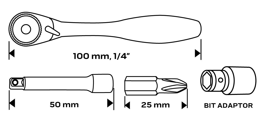 Zestaw bitów, 26 sztuk 56-604 marki NEO TOOLS składa się z profili bitów: SL, PH, PZ, TT, HEX; 5 sztuk nasadek ¼” oraz akcesoriów wykonanych ze stali S2. W skład wchodzi 18 sztuk bitów o długości 25 mm, przedłużka ¼” kwadrat o długości 50 mm, adapter ¼” kwadrat na ¼” HEX oraz grzechotka ¼” o długości 100 mm. Konfiguracja zestawu zapewnia kompatybilność ze standardowymi uchwytami 1/4" HEX.