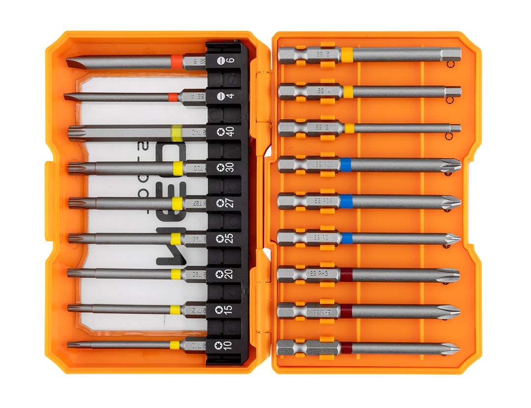 Zestaw bitów PH1, PH2, PH3, PZ1, PZ2, PZ3, SL4, SL6, H3, H4, H5, T10, T15, T20, T25, T27, T30, T40 o długości 75 mm, uchwyt 1/4" HEX, stal S2, zestaw 18 elementów