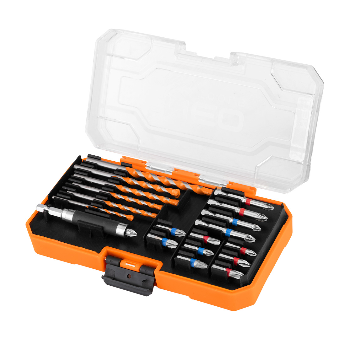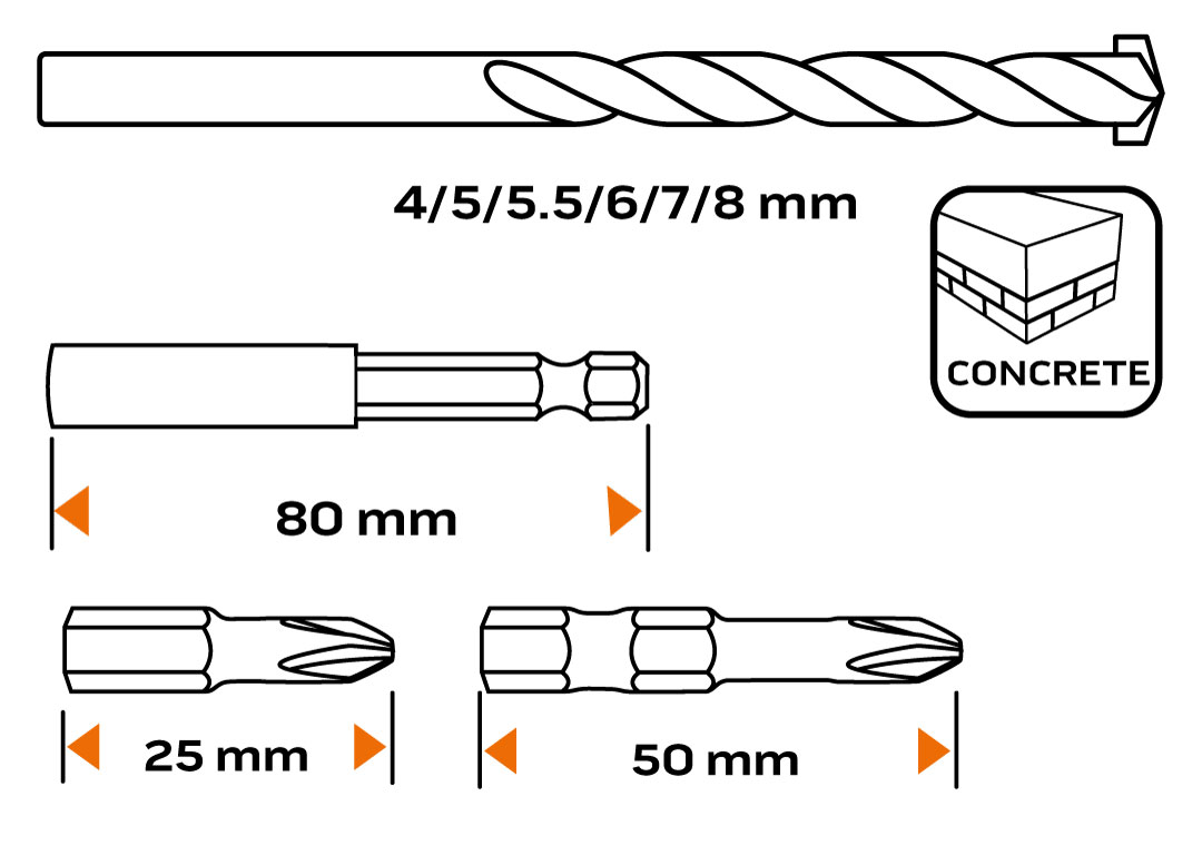 Zestaw wierteł i bitów, 20 szt. – 6x wiertła do betonu o średnicach: 4, 5, 5.5, 6, 7, 8 mm, 9x bity 25mm: PH 1/2x2/3x2, PZ 1/2x2, 4x bity 50mm: PH 1/2 mm, PZ 1/2 mm, uchwyt do bitów o długości 80 mm, materiał wykonania: stal S2