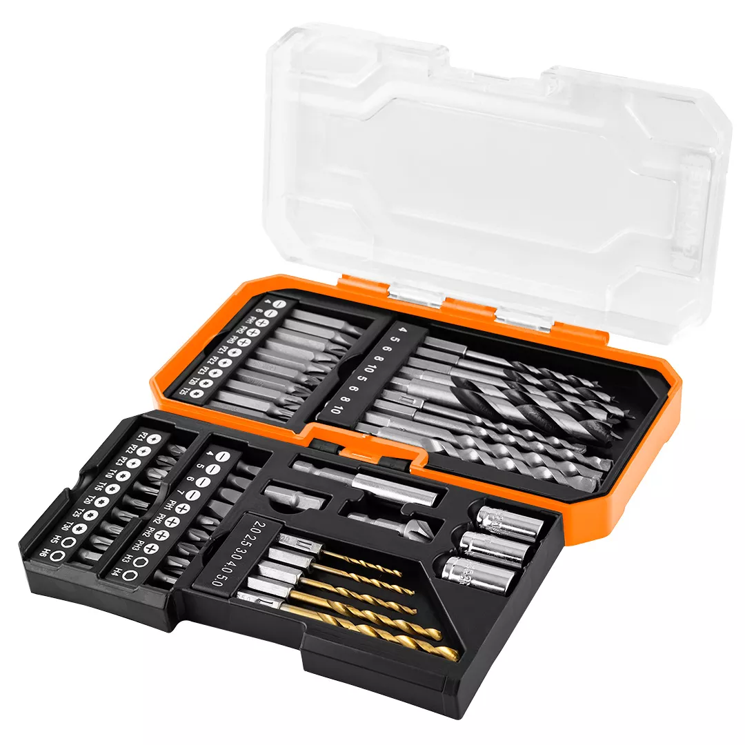 Zestaw wierteł i bitów, 50 szt. - 5x wiertła do metalu TiN, Hex: 2, 2.5, 3, 4, 5 mm; 4x wiertła do betonu Hex: 5, 6, 8, 10 mm; 5x wiertła do drewna Hex: 4, 5, 6, 8, 10 mm; 20x bity o długości 25mm: SL 4/5/6/7 mm, PH 1/2/2/3 mm, PZ 1/2/3 mm, TX T10/T15/T20/T25/T30 mm, HEX 3/4/5/6 mm, 10x bity o długości 50mm: SL 4/6 mm, PH 1/2/3 mm, PZ 1/2/3 mm, TX T20/T25 mm, 3x nasadki: 7, 8, 10 mm; adapter 1/4" na HEX o długości 25 mm, uchwyt magnetyczny do bitów o długości 60 mm, wiertło do fazowania HEX