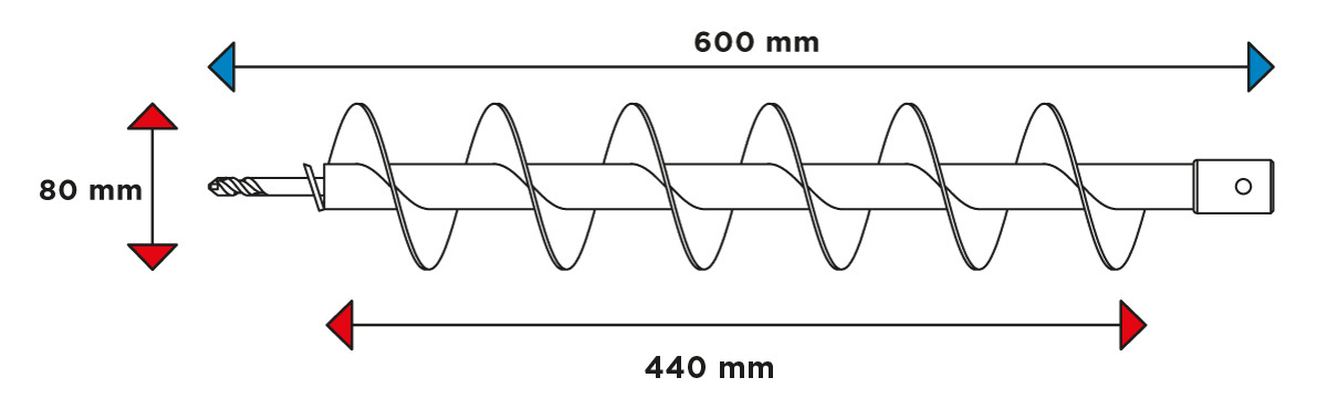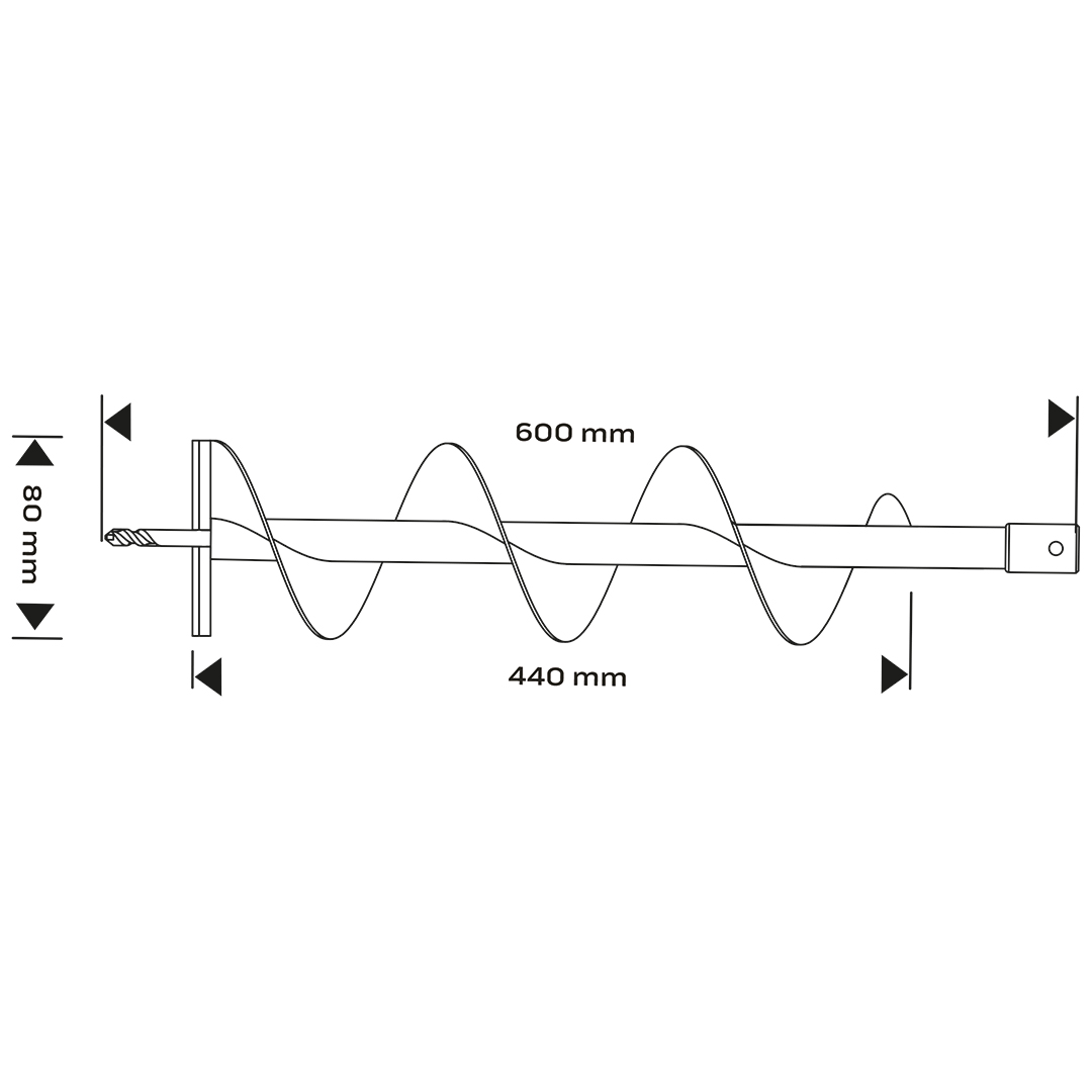 Świder glebowy, średnica 80 mm, długość całkowita 600 mm, długość robocza 440 mm, uchwyt M14, grubość łopatek 4 mm, 65 Mn, do mieszarki 58G084, stalowa konstrukcja, podwójna płytka, pojedyncza spirala.